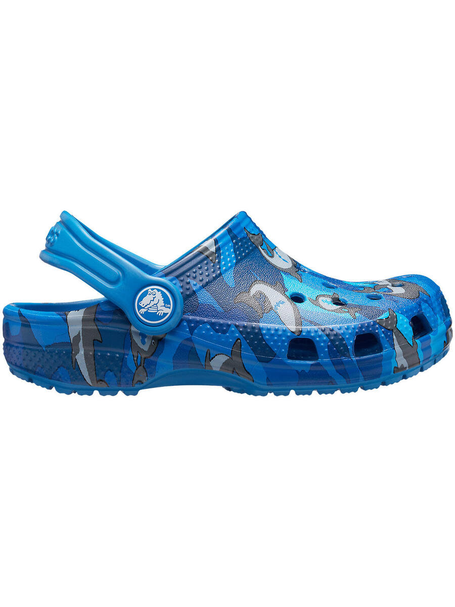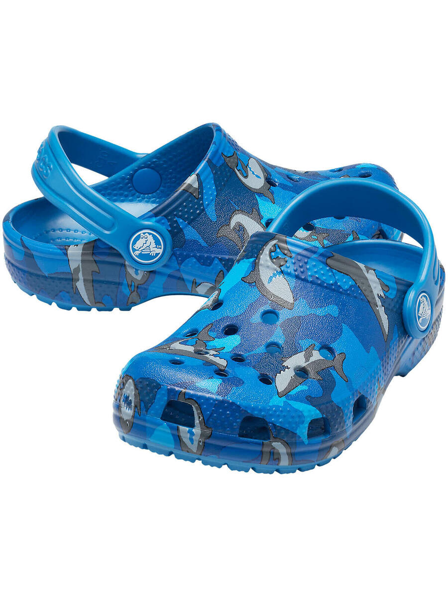 Новый, захватывающий рисунок с акулами обязательно сделает эту модель любимым спутником в школе, на играх и активных приключениях. Дошкольникам понравятся яркие цвета и уникальный комфорт. Родителям понравится удобный, универсальный и простой в уходе дизайн. Классические сабо Crocs Classic Clogs предлагают лёгкий дизайн Iconic Crocs Comfort в расцветке на любой вкус и напоминают детям всех возрастов, как весело играть на улице.