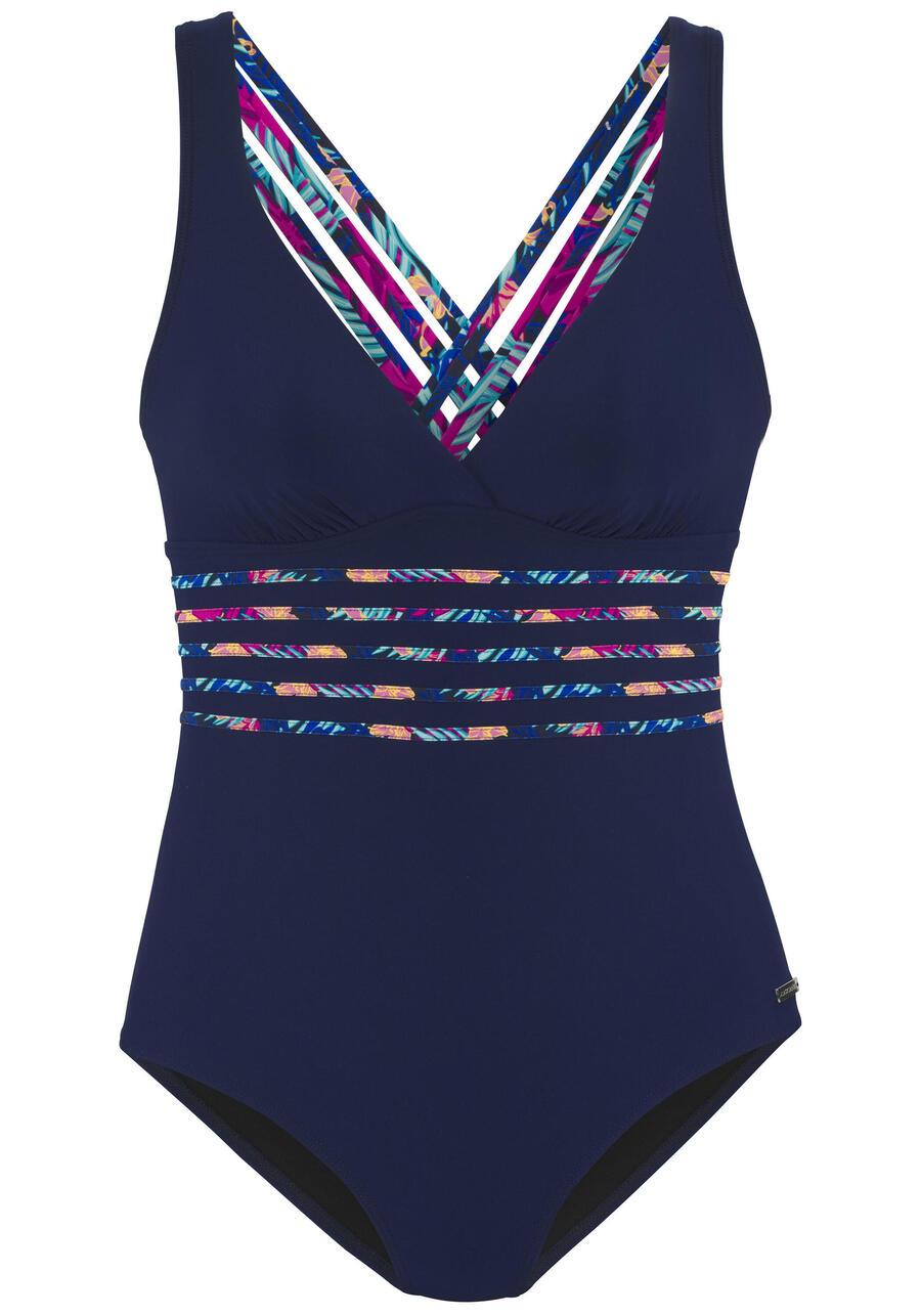 Однотонный купальник Lascana с модными принтованными вставками на талии и V-образным вырезом. Бретели перекрещиваются на шее. Комфортная ткань с переработанным полиамидом. GOA-260