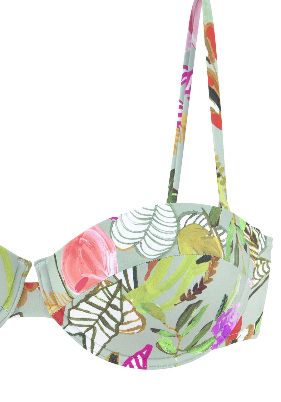 Великолепный верх-балконет от S. Oliver с модным рисунком. Регулируемые бретели для утягивания. Чашечки с подкладкой и боковыми усилениями. Боковые вставки с застёжкой сзади. Из серии Mix-Kini. Материал: переработанный полиамид. MAY-522