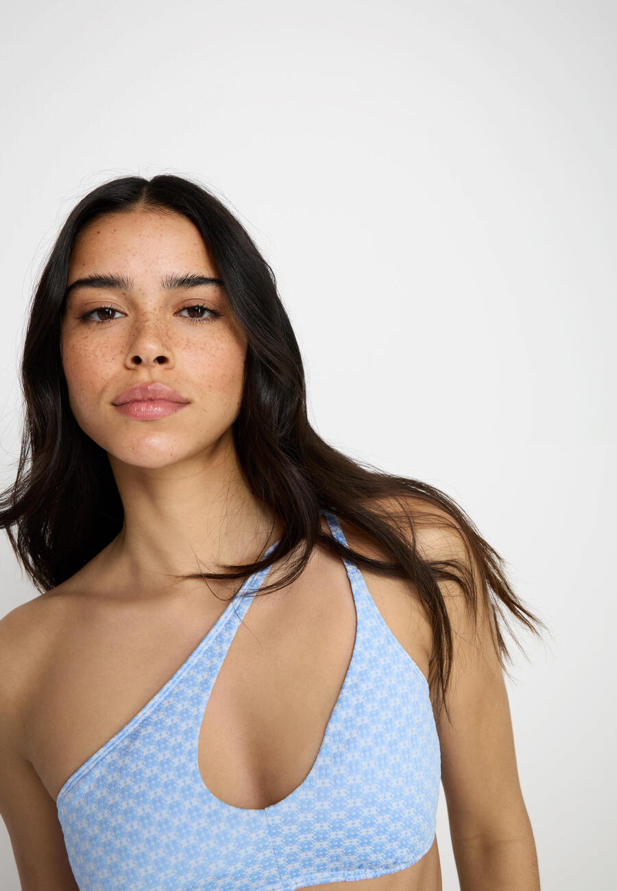Асимметричное бикини-бюстье от Lascana. Модель на одно плечо с вырезом. Облегающие плавки с V-образным вырезом. Модная фактурная ткань. ING-563D