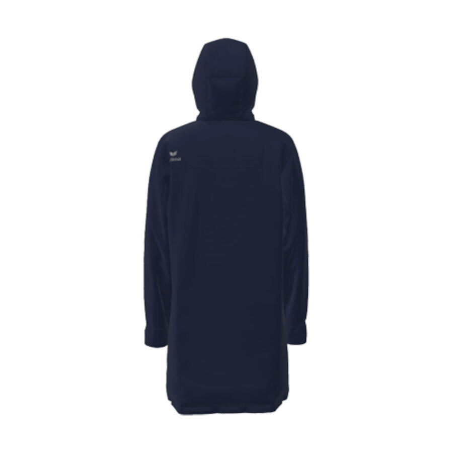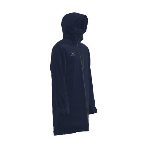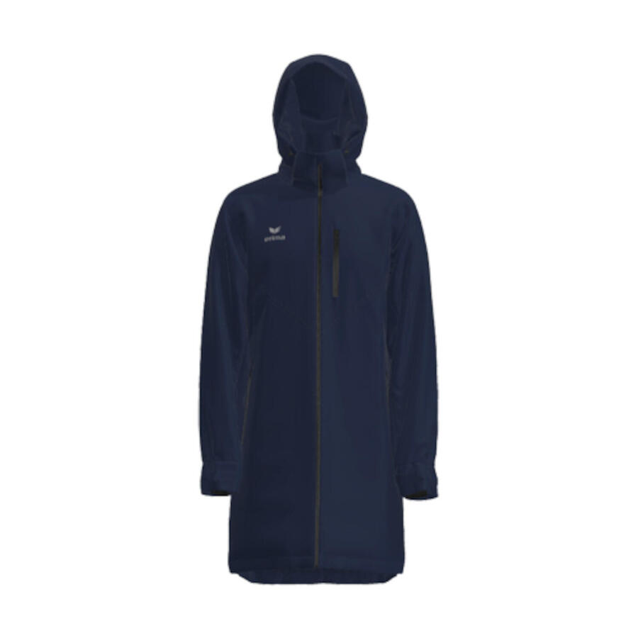 Мужская куртка ERIMA Stadium. Куртка на подкладке с водоотталкивающей мембраной, водонепроницаемая до 5000 мм. Съёмный капюшон со шнурком. Двусторонняя молния с флисовой защитой подбородка с внутренней стороны. Нагрудный карман на молнии. Боковые карманы на молнии. Внутренний карман. Большие сетчатые внутренние карманы. Манжеты с отверстиями для больших пальцев и застёжками-липучками на рукавах. Логотип ERIMA на груди. Материал: 100% полиэстер.