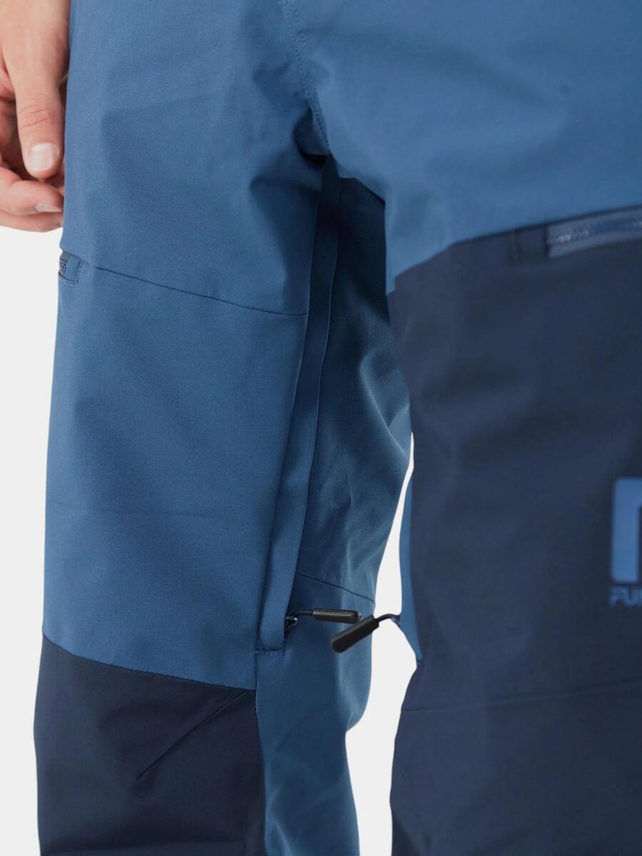 Снегозащитный экран, который можно прикрепить к лыжной куртке, предотвращает попадание снега под одежду даже при сильном падении. В передних карманах на молнии удобно хранить ценные вещи. Вентиляционные отверстия на молнии позволяют легко регулировать теплоотдачу. Съёмные регулируемые подтяжки и регулируемый пояс позволяют полностью подогнать куртку по фигуре. Воздухопроницаемость 10 000 г/м²/24 ч.