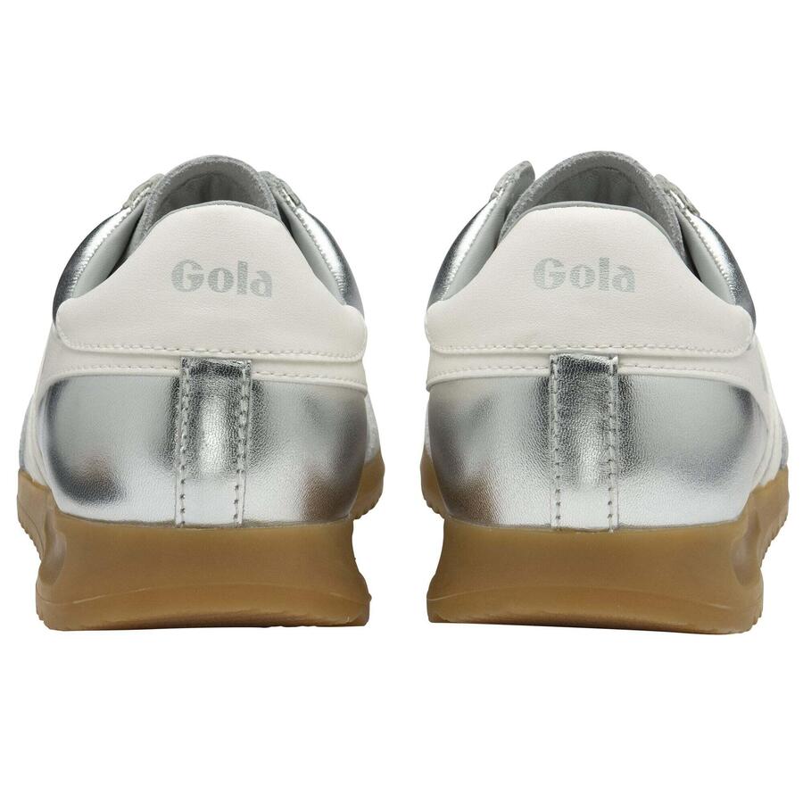 Кроссовки Torpedo Leather от Gola прочно вошли в моду, и с момента своего появления в 1985 году модель Torpedo Leather быстро завоевала популярность в женской коллекции. Команда дизайнеров Gola переработала Torpedo, добавив короткий носок и удлинённые шнурки, сочетая современную серебристо-металлическую отделку с эффектным контрастом: логотип Gola вишнево-красного цвета и петля на пятке. В результате получилась обувь, которая приковывает к себе внимание — очередь на покупку уже видна! Наследие Gola 1985 года: кроссовки с низким профилем, женские кроссовки на шнуровке, женские кроссовки, женские серебристые кроссовки.