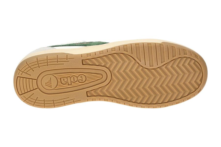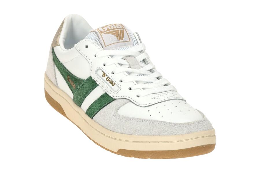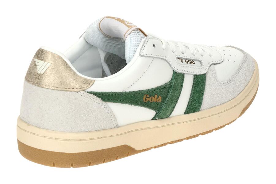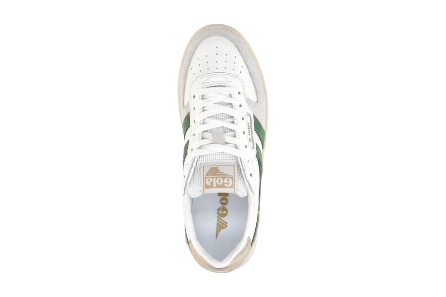 Женские кроссовки Gola HAWK — стильные кроссовки в белом, тёмно-зелёном и золотом цветах. Верх выполнен из гладкой кожи, замши и сетки, а стелька — из удобного текстиля.