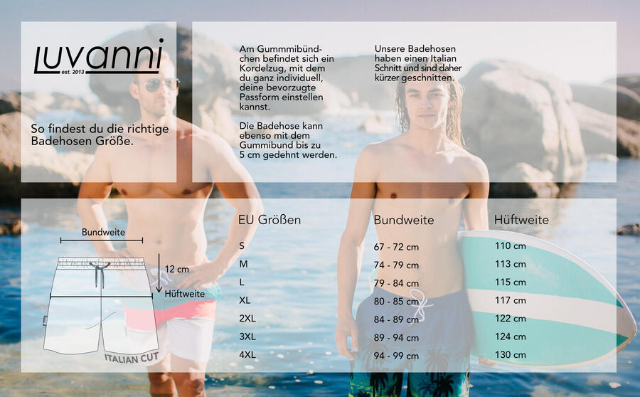 Итальянский крой — спортивный, укороченный. Шорты для плавания очень быстро сохнут и отличаются особой прочностью. Внутренние плавки и два кармана изготовлены из прочной сетчатой ткани с двойными швами. 100% полиэстер. Внутренний материал: полиэстер. Рекомендации по уходу: 30 °C. Высокий комфорт при носке — широкий пояс со шнурком обеспечивает надёжную посадку не только во время плавания, но и во время занятий всеми популярными водными видами спорта. Привлекательный, современный и модный дизайн от бренда LUVANNI.