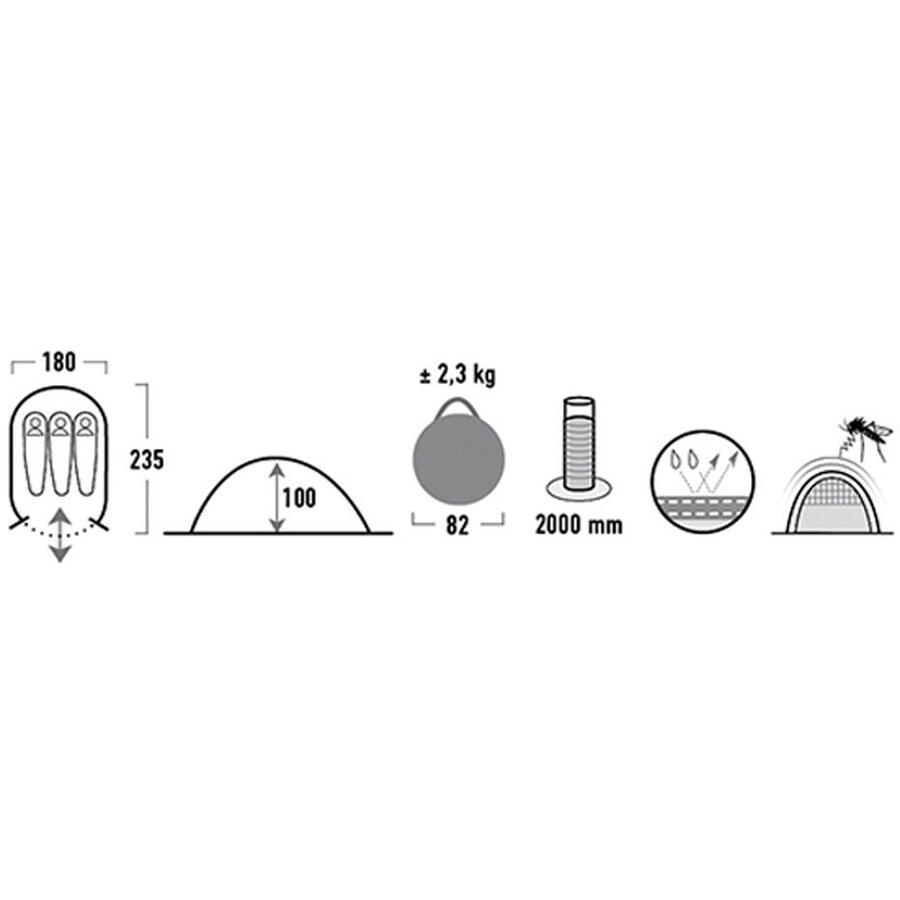 Палатка Vision 3 быстро устанавливается и вмещает трёх человек с лёгким багажом. Три постоянных вентиляционных отверстия обеспечивают приятный микроклимат. Идеально подходит для кемпинга выходного дня, фестивалей и отдыха в саду.