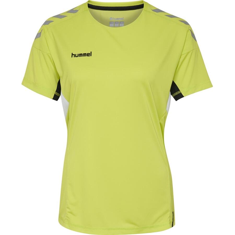 Женская футболка Hummel Tech Move, размер S/S. Легкий трикотаж из полиэстера. Вентилируемые сетчатые боковые вставки. Обработка BeeCool. Принт с шевронами и логотипом. Ребристый вырез горловины. Классический крой. Материал: 100% полиэстер.