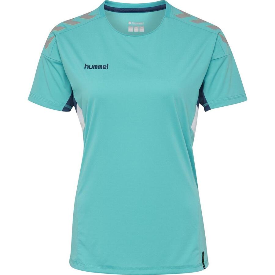 Женская футболка Hummel Tech Move, размер S/S. Легкий трикотаж из полиэстера. Вентилируемые сетчатые боковые вставки. Обработка BeeCool. Принт с шевронами и логотипом. Ребристый вырез горловины. Классический крой. Материал: 100% полиэстер.