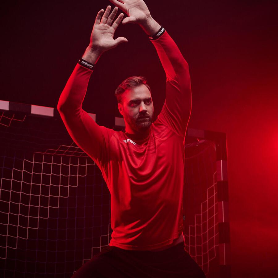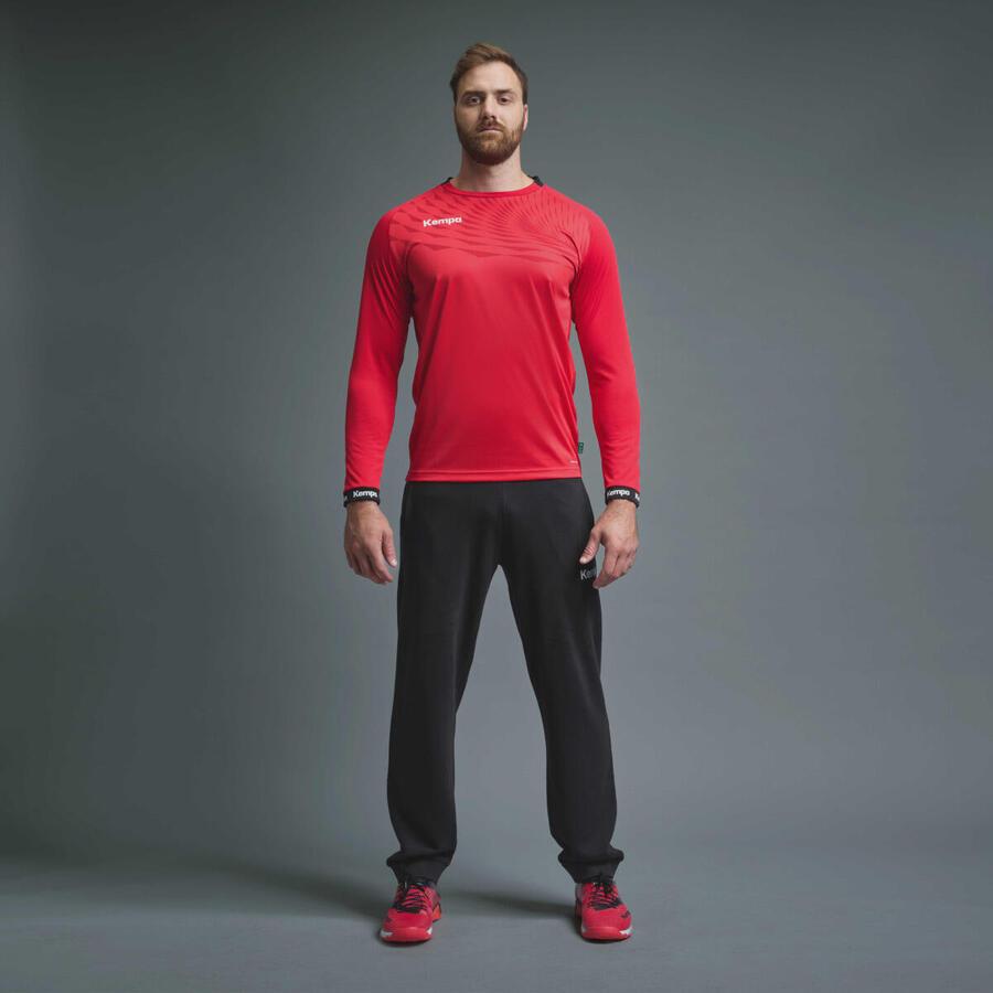 Мужская рубашка Kempa Wave 26 с длинным рукавом. Круглый вырез контрастного цвета. Волна с треугольными элементами. Эластичные принты Kempa и K-Label. Технологичный крой с рукавами реглан. Манжеты с надписью Kempa контрастного цвета. Технология 2face dry. Материал: 100% полиэстер.