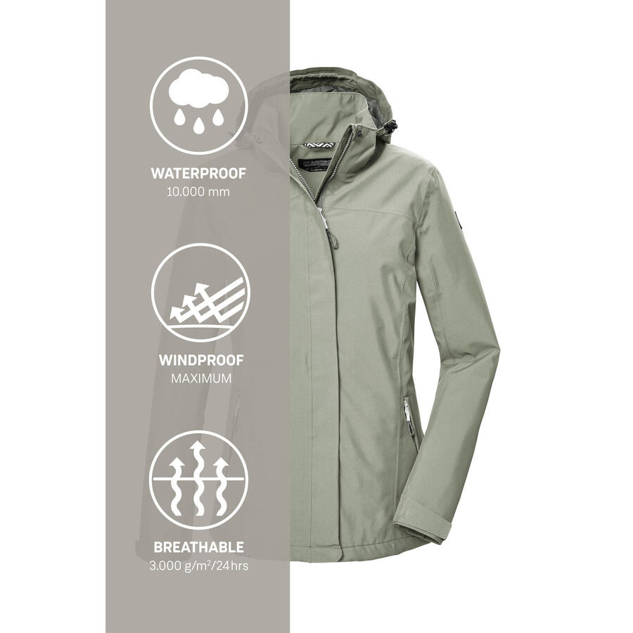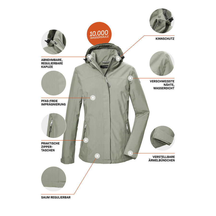 Эта женская функциональная куртка от killtec — идеальный выбор для ветра и непогоды. Водонепроницаемость 10 000 мм водяного столба и сварные швы делают ее водонепроницаемой и ветрозащитной (наш совет: куртку следует периодически повторно водонепроницаемой). В то же время она дышащая с паропроницаемостью 3 000 г/м²/24 ч. Капюшон регулируется и при необходимости полностью снимается. Манжеты регулируются застёжками-липучками. Потайная молния оснащена практичной защитой подбородка. Два боковых кармана застёгиваются на молнии, чтобы ничего не потерялось. Внутренний карман для мобильного телефона обеспечивает дополнительное место для хранения. Компания Killtec уделяет особое внимание экологичности своих коллекций и их перспективности. Поэтому killtec уделяет всё больше внимания ответственным производственным процессам. Эта куртка обработана пропиткой без ПФАС и частично изготовлена из переработанных материалов.