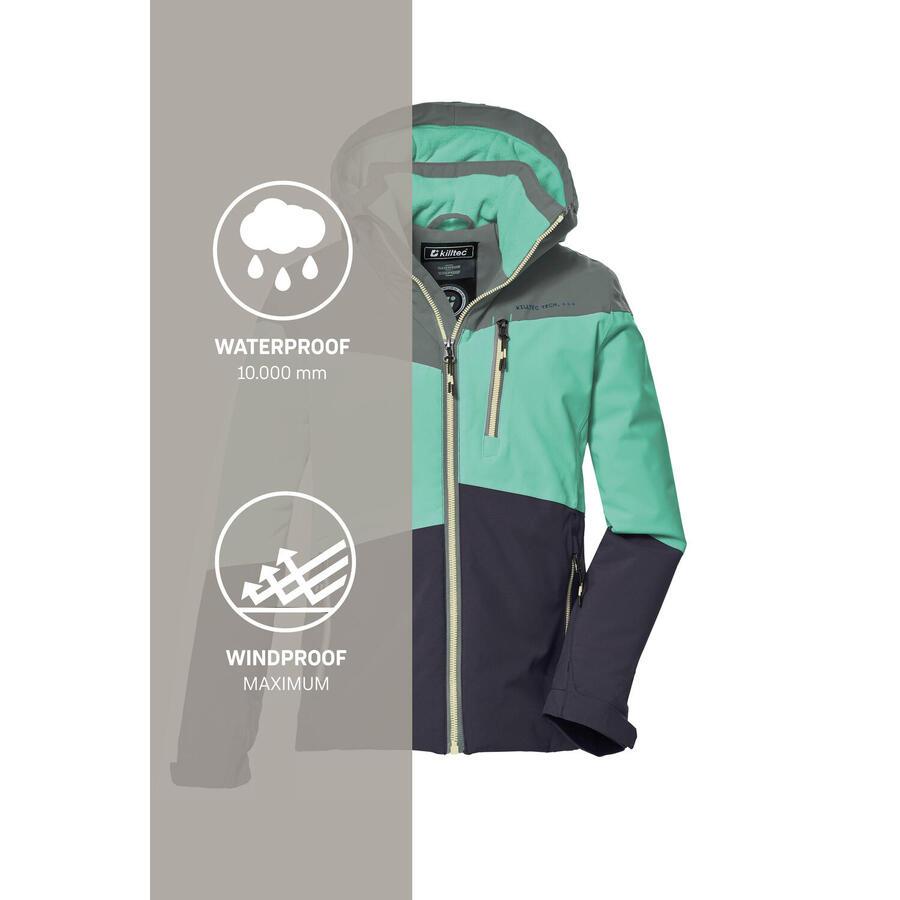 Детская функциональная куртка с капюшоном и снегозащитой. 10 000 мм водяного столба, сварные швы, водонепроницаемая. Теплая флисовая подкладка внутри. Многочисленные карманы, молния с защитой подбородка. Дизайн с цветными блоками, модные светоотражающие элементы. Название: KOW 170 GRLS JCKT. Сезон: Осень/Зима. С этой детской функциональной курткой с капюшоном от killtec зима может наступить. Асимметричный дизайн с цветными блоками в модных цветах поднимет вам настроение. Куртка имеет сварные швы и на 100% водонепроницаема и ветрозащитна с защитой 10 000 мм водяного столба. Мягкая флисовая подкладка внутри прекрасно сохраняет тепло. Нескользящая снегозащита предотвращает проникновение холода и сырости. Манжеты регулируются застежками-липучками. Два боковых кармана, нагрудный карман и внутренний карман предлагают достаточно места для хранения вашего мобильного телефона и других необходимых вещей. Передняя молния имеет практичную защиту подбородка. Зимняя куртка также украшена модными светоотражающими элементами. Компания Killtec уделяет особое внимание экологичности и перспективности своих коллекций. Killtec уделяет всё больше внимания ответственным производственным процессам. Поэтому эта куртка пропитана веществами без содержания фтора.