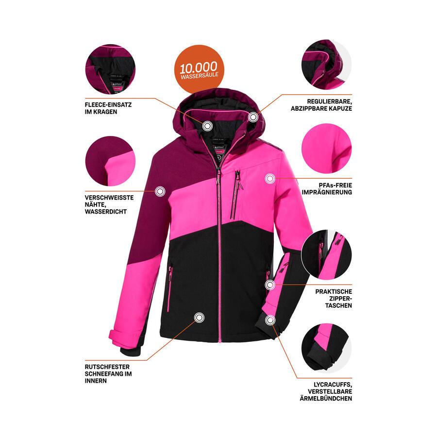 Горнолыжная куртка для девочек с капюшоном в цветном дизайне. Водонепроницаемость 10 000 мм водяного столба, проклеенные швы, водонепроницаемая, дышащая, паропроницаемость 3000 г/м²/24 ч. Противоскользящая защита от снега, сетчатая вставка, множество карманов. Регулируемый капюшон на молнии, регулируемый подол. Регулируемые манжеты с лайкрой. Водонепроницаемость без PFA, безопасна для вас и окружающей среды. Название: KSW 166 GRLS SKI JCKT. Сезон: осень/зима. Спортивная горнолыжная куртка Killtec в цветном дизайне идеально подходит для катания на склонах и любых зимних приключений. Дышащее, водонепроницаемое и ветрозащитное покрытие (10 000 мм, 3 000 мм) и 100% полиэстер (100% эластан) и сварные швы обеспечивают комфортный микроклимат тела. Благодаря теплой флисовой подкладке и терморегулирующей сетчатой вставке куртка сохраняет вас в тепле и уюте. Лайкровые манжеты на регулируемых манжетах и нескользящая снегозащитная вставка предотвращают проникновение ветра и холода. Капюшон с козырьком и резинкой регулируется и при необходимости снимается. Ширина подола регулируется шнурком. Многочисленные внутренние и внешние карманы обеспечивают достаточно места для хранения всех ваших необходимых вещей. Передняя молния оснащена защитой подбородка. Killtec особенно стремится сделать свои коллекции более экологичными и перспективными. Поэтому killtec уделяет все больше внимания более ответственному процессу производства. Поэтому эта куртка пропитана веществами, не содержащими фтора.