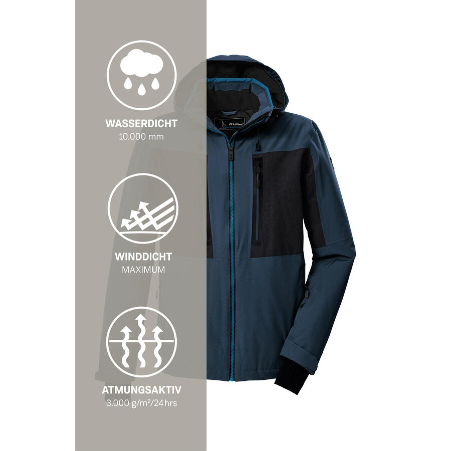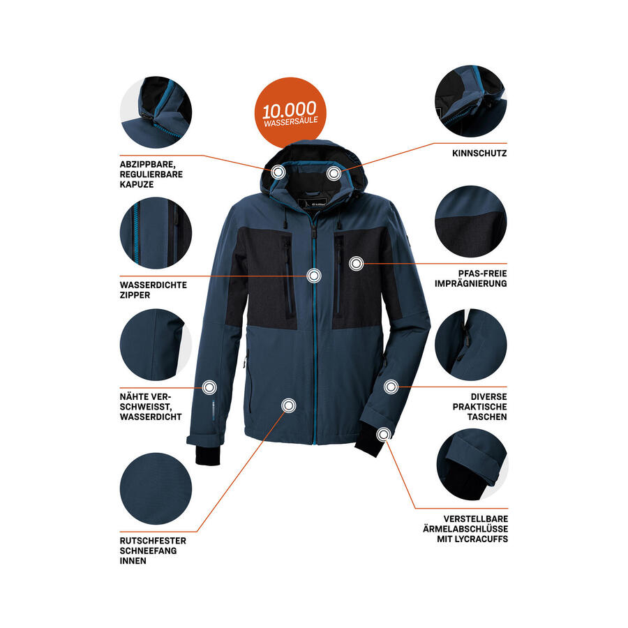 С этой мужской горнолыжной курткой от killtec веселье на склонах может начаться. Куртка впечатляет своим цветовым блоком и множеством практичных функций. Она дышащая, паропроницаемость 3000 г/м²/24 ч. Благодаря проклеенным швам и водонепроницаемым молниям она водонепроницаемая и ветронепроницаемая (наш совет: куртку время от времени следует пропитывать). Регулируемый капюшон можно снять при необходимости. Снегозащитный экран с нескользящим резиновым покрытием защищает от проникновения влаги. Многочисленные карманы позволяют разместить ски-пасс, горнолыжные очки и другие вещи. Подол куртки регулируется индивидуально. Регулируемые манжеты из лайкры с удобными отверстиями для больших пальцев. Компания Killtec уделяет особое внимание экологичности своих коллекций и их перспективности. Поэтому killtec уделяет всё больше внимания ответственным производственным процессам. Эта куртка обработана пропиткой без ПФА и частично изготовлена из переработанных материалов.