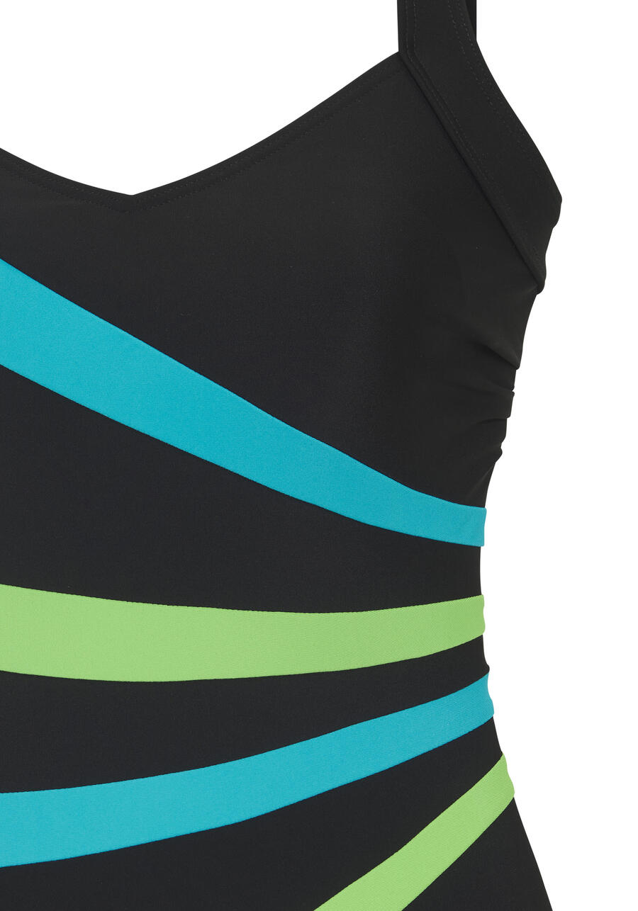 Купальник Lascana с радиальными контрастными вставками. Мягкие интегрированные чашки. Передняя часть с утягивающей вставкой и резинкой под грудью для дополнительного комфорта. Высокая прямая спинка. Классический крой. Комфортный материал с переработанным полиамидом. GOA-274