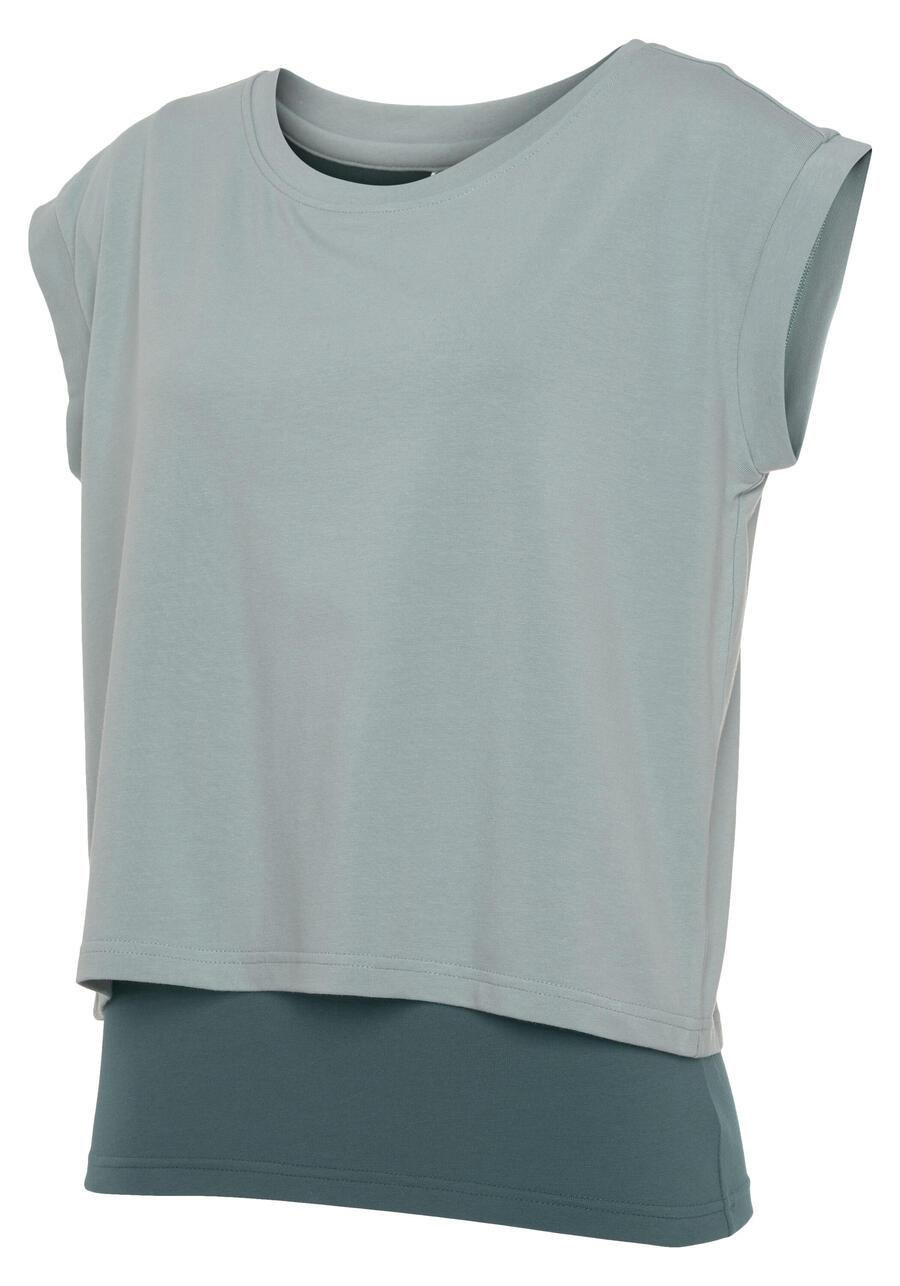 Однотонная спортивная футболка Lascana Active с многослойным дизайном. Круглый вырез. Короткая рубашка со спущенными плечами. Верхняя часть с борцовкой. Мягкий трикотаж. LA-153-49