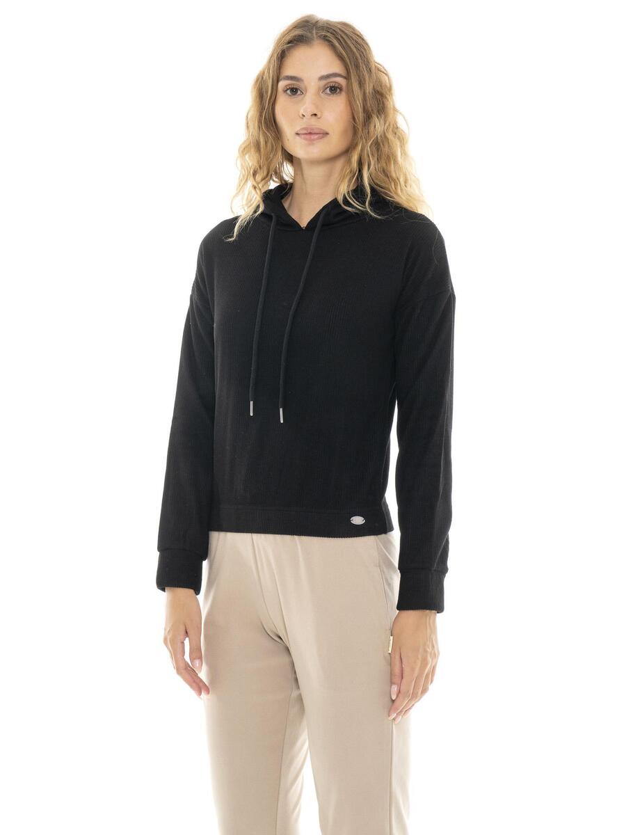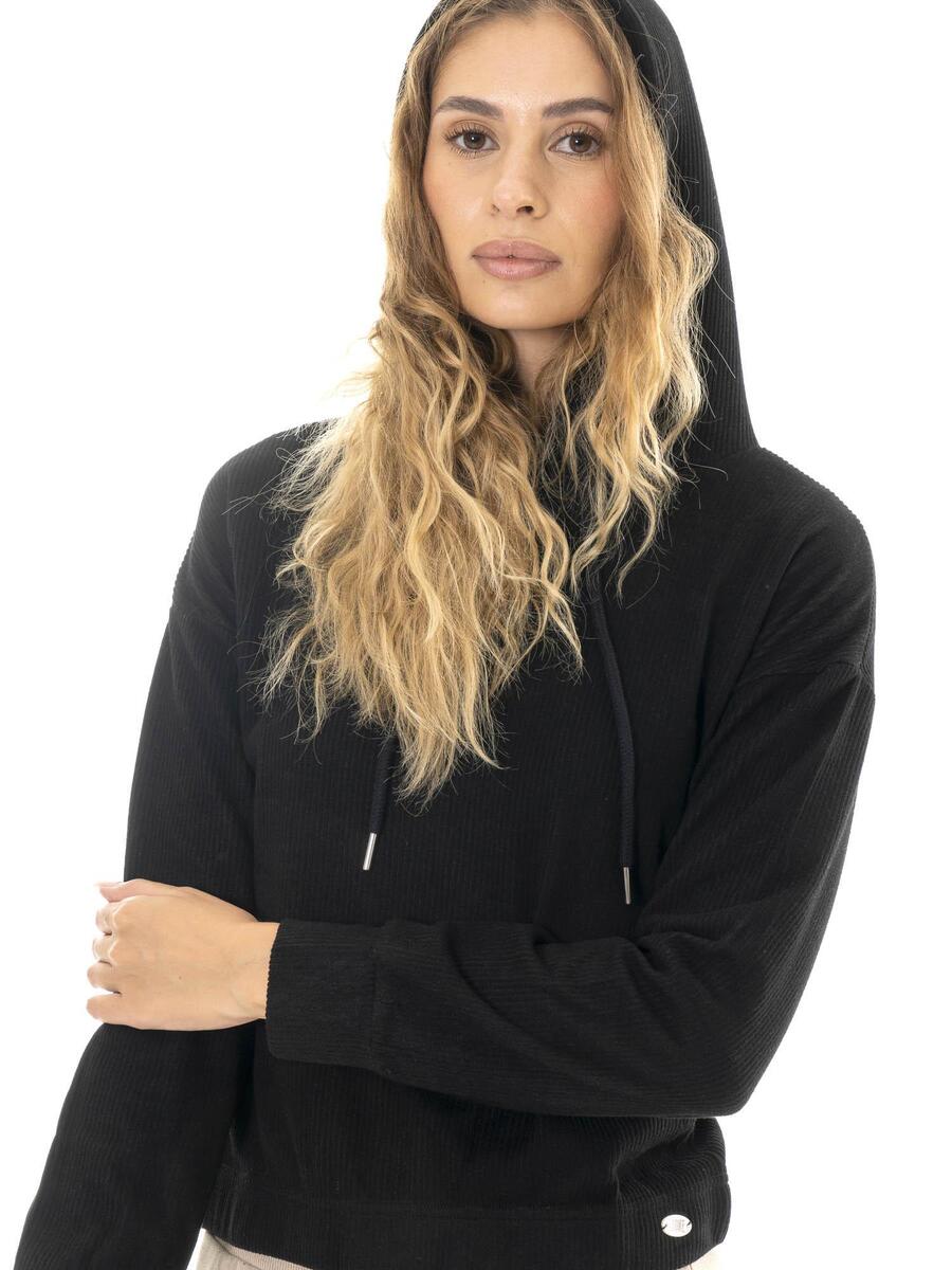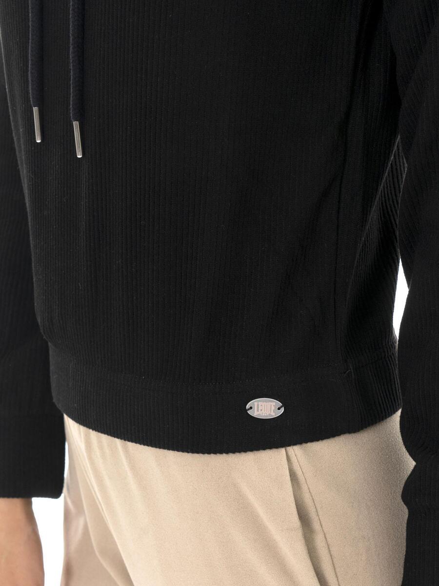 Короткая женская толстовка из тонкой эластичной резинки. Изделие имеет капюшон с регулируемым шнурком и металлическими завязками. Манжеты из эластичной резинки обеспечивают идеальную посадку. Слева внизу прикреплена небольшая металлическая пластинка с логотипом Leone 1947.