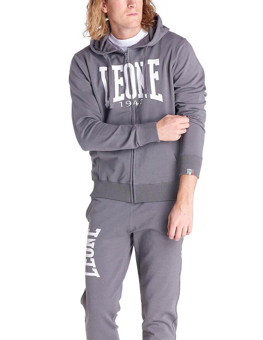 Мужская толстовка с капюшоном на молнии Leone 1947 Apparel Basic Big Logo. Толстовка с начесом, принт с логотипом на водной основе, внутренняя часть капюшона из окрашенного трикотажа, контрастный капюшон, пластиковая молния, фирменная металлическая молния, люверсы из состаренного серебра, хлопковый шнурок, тканые этикетки Leone 1947 Apparel.