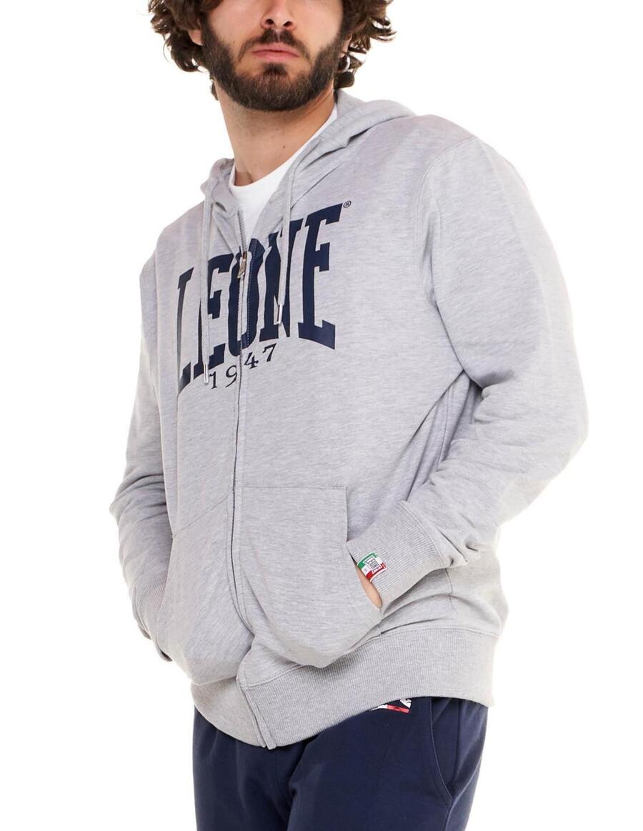 Мужская толстовка с капюшоном на молнии Leone 1947 Apparel Light Big Logo. Толстовка без начеса, принт с логотипом на водной основе, внутренний капюшон из контрастного трикотажа, пластиковая молния, люверсы из состаренного серебра, хлопковый шнурок, фирменная металлическая молния, этикетки Leone 1947 Apparel.