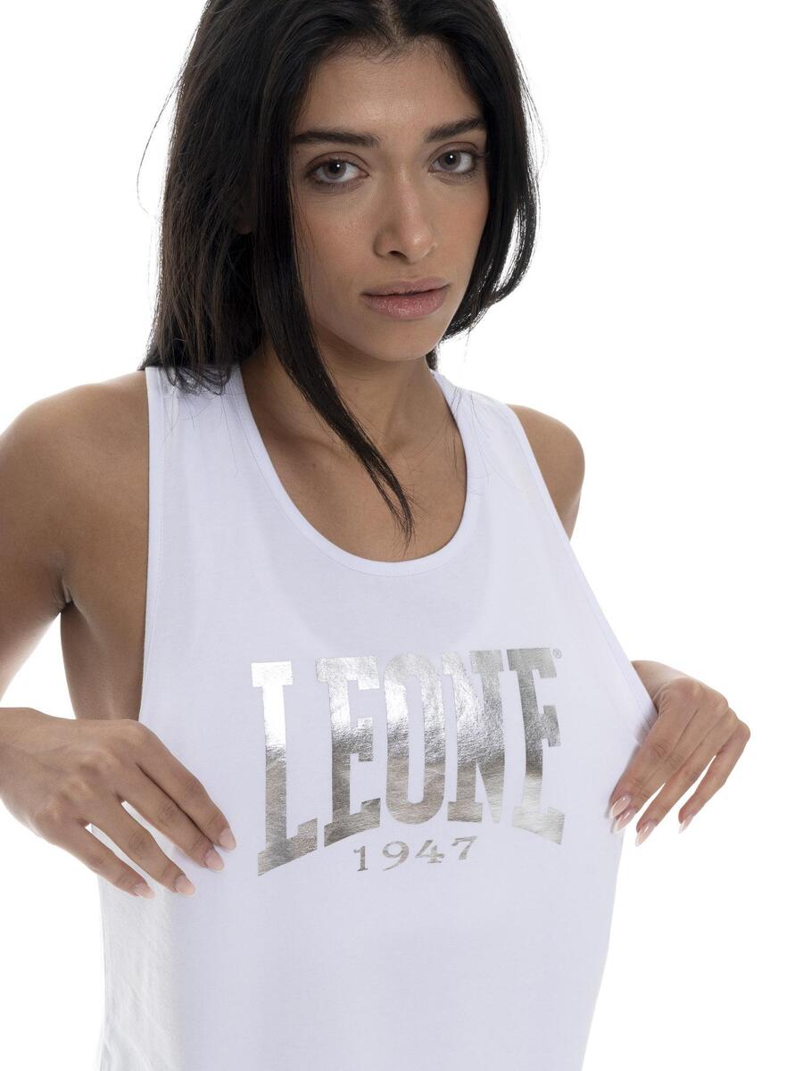 Женская майка из эластичного хлопка с большим металлическим логотипом в виде листа по центру.