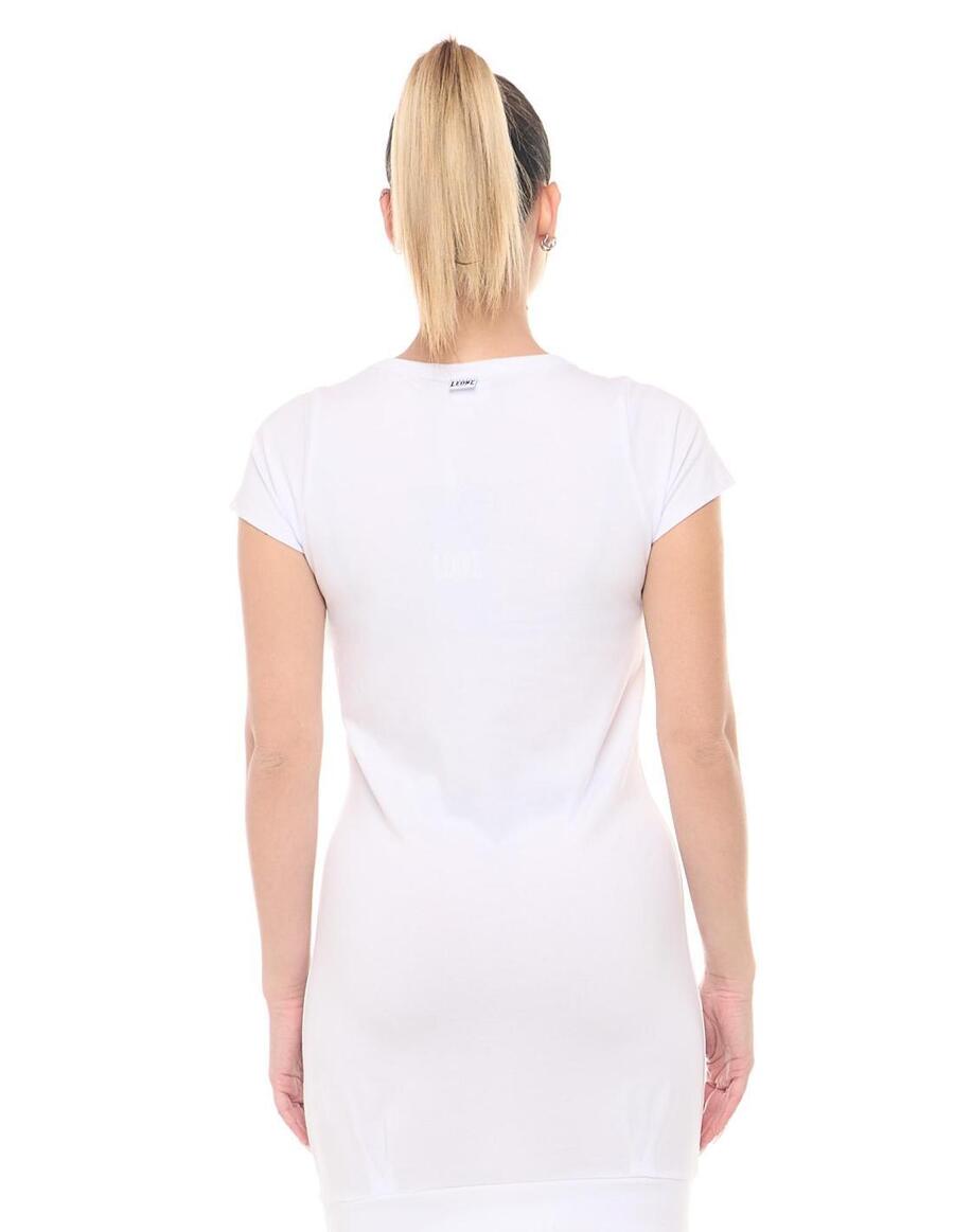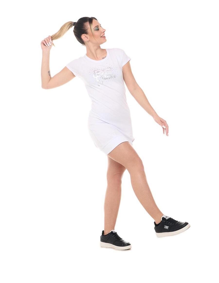 Футболка макси, длина платья. Изготовлена из эластичного хлопка, с биркой со стразами по центру.
