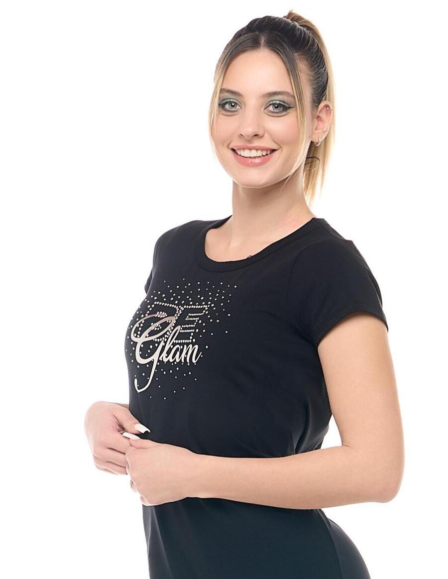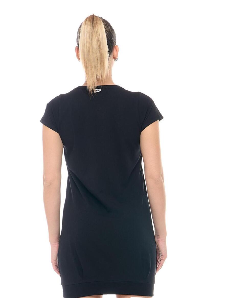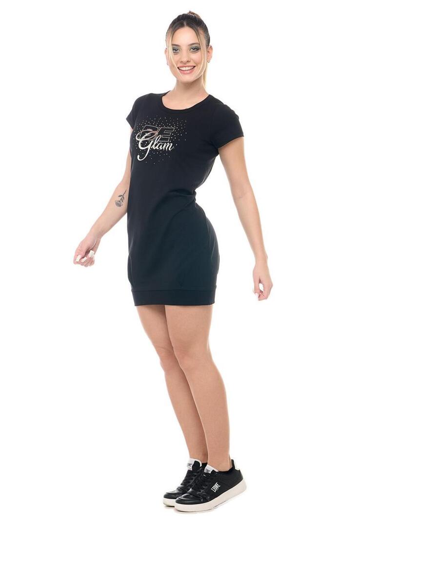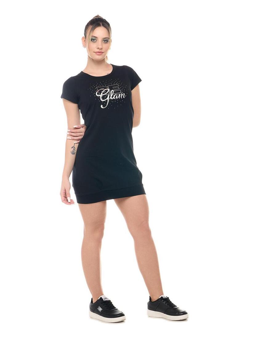 Футболка макси, длина платья. Изготовлена из эластичного хлопка, с биркой со стразами по центру.
