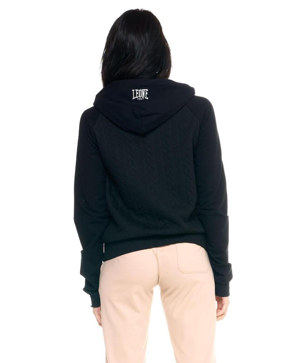 Женская толстовка Leone 1947 Apparel из коллекции Leone Greyss, выполненная из двухслойной ткани: жаккарда с плетеным эффектом и эластичной толстовки. Детали: рукава реглан из контрастной ткани, плетеная нагрудная вставка с застежкой-молнией по всей длине с металлическим бегунком, контрастный флисовый капюшон со шнурком и металлическими наконечниками. Вышитый логотип по центру капюшона.