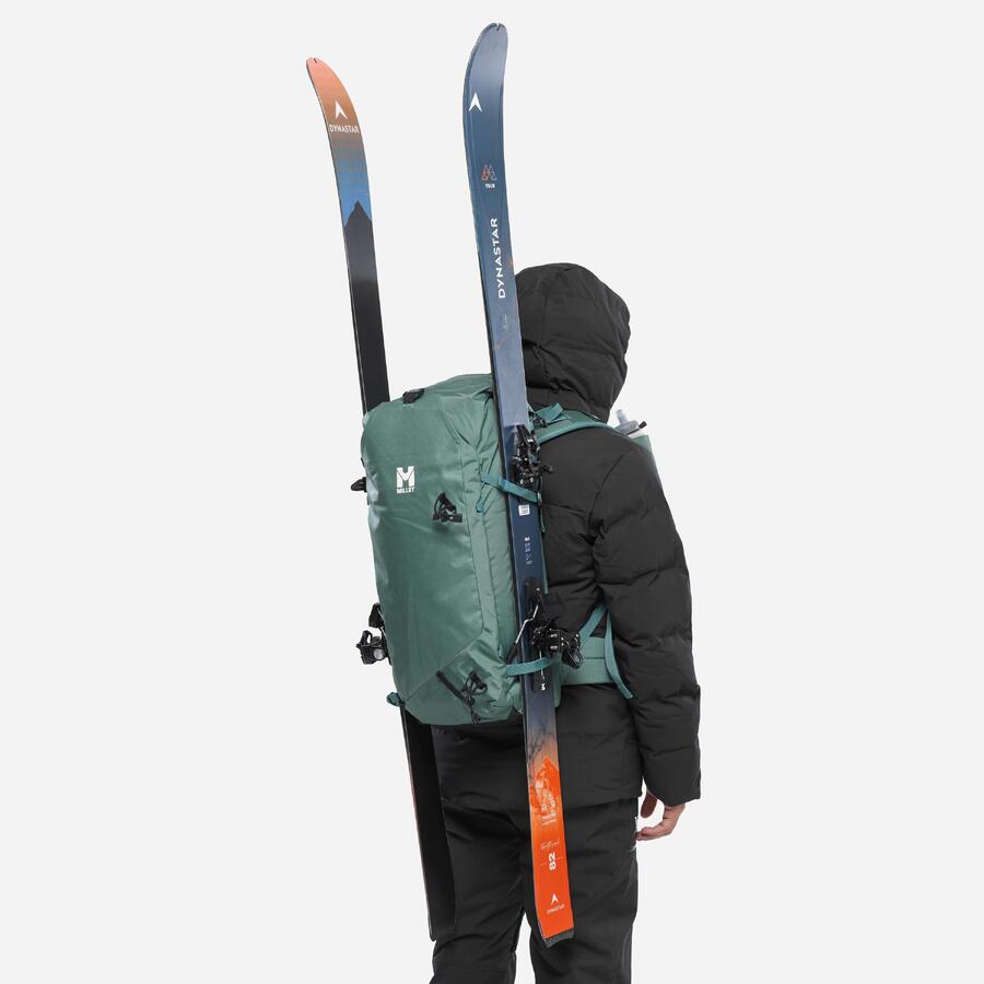 Перед тем, как достичь вершины, мы крепим лыжи к боковому или диагональному креплению для лыж и снимаем ледоруб и шлем с креплений. Даже полностью загруженный наш альпинистский рюкзак не будет скользить благодаря эргономичным плечевым ремням с распределением нагрузки и регулируемым нагрудному и поясному ремням. Его тонкий профиль идеально подходит для технически сложных лыжных туров и альпинистских экспедиций.