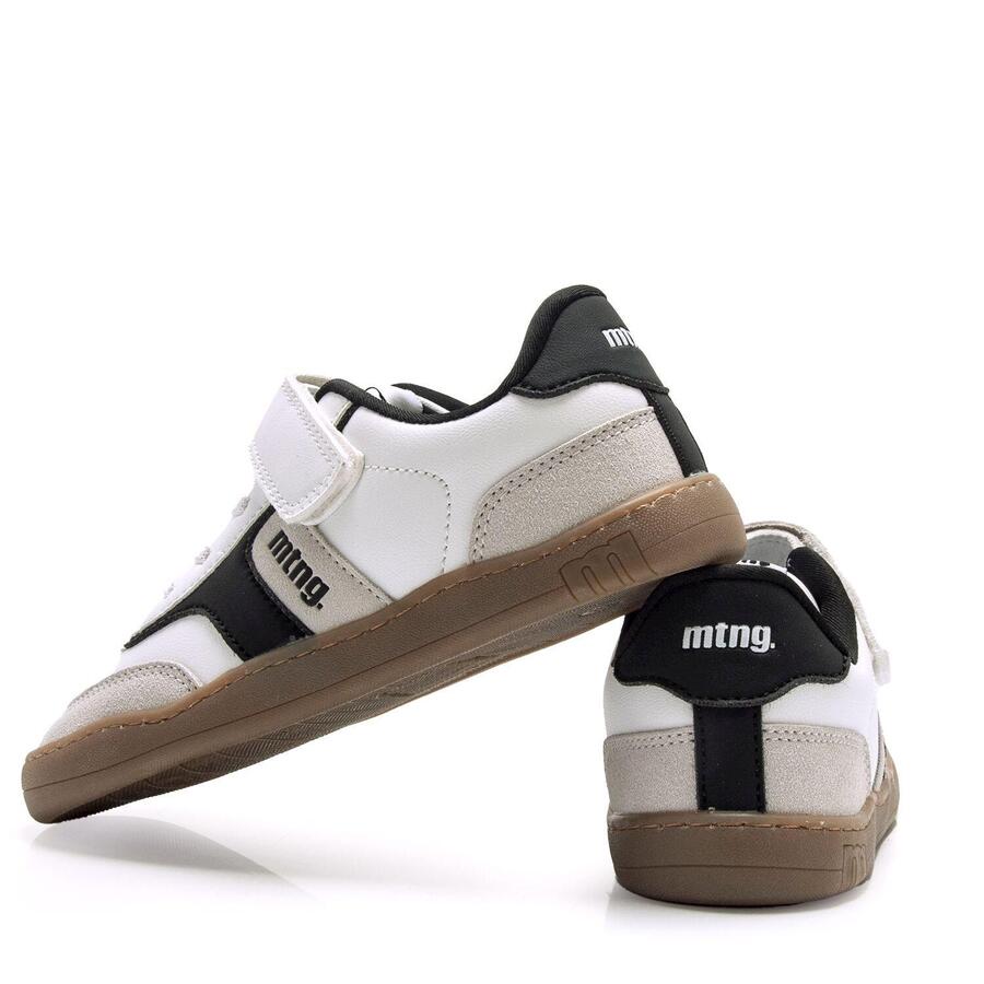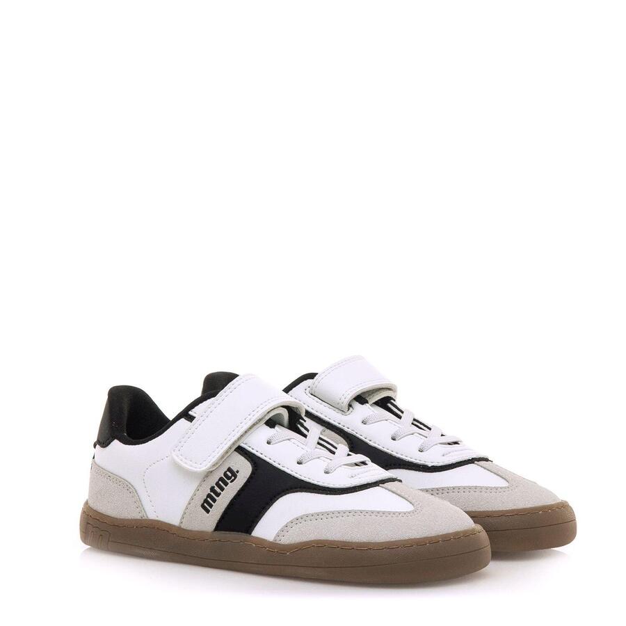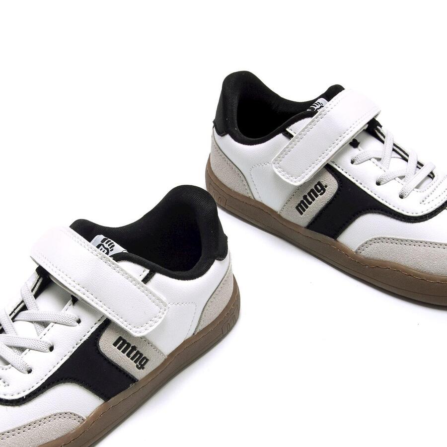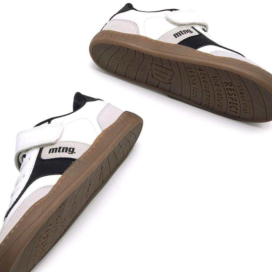Белые кроссовки для мальчиков с черно-серыми деталями от бренда Mtng, модель Free. Подошва карамельного цвета добавляет современный и оригинальный штрих. Застежка-липучка в сочетании с эластичными шнурками обеспечивает удобную и быструю посадку. Разработаны специально в сотрудничестве с доктором Хуанхо Лопесом, специалистом по спортивной и детской травматологии, для поддержки естественного развития детской стопы. Широкий носок позволяет пальцам свободно двигаться внутри обуви. Съемные стельки облегчают проверку размера и помогают подобрать обувь подходящего размера для вашего ребенка. Кроме того, легкое открывание позволяет ребенку самостоятельно надевать и снимать обувь. Сертифицировано INESCOP как VEGAN, что гарантирует отсутствие в основном материале волокон животного происхождения. Стиль: Повседневный Основной материал: Синтетика Внутренний материал: Синтетика Материал стельки: Синтетика Материал подошвы: Резина Тип каблука: Плоский Высота каблука: Низкий (от 1 до 3 см) Форма носка: Круглая Тип застежки: Шнурки - липучка
