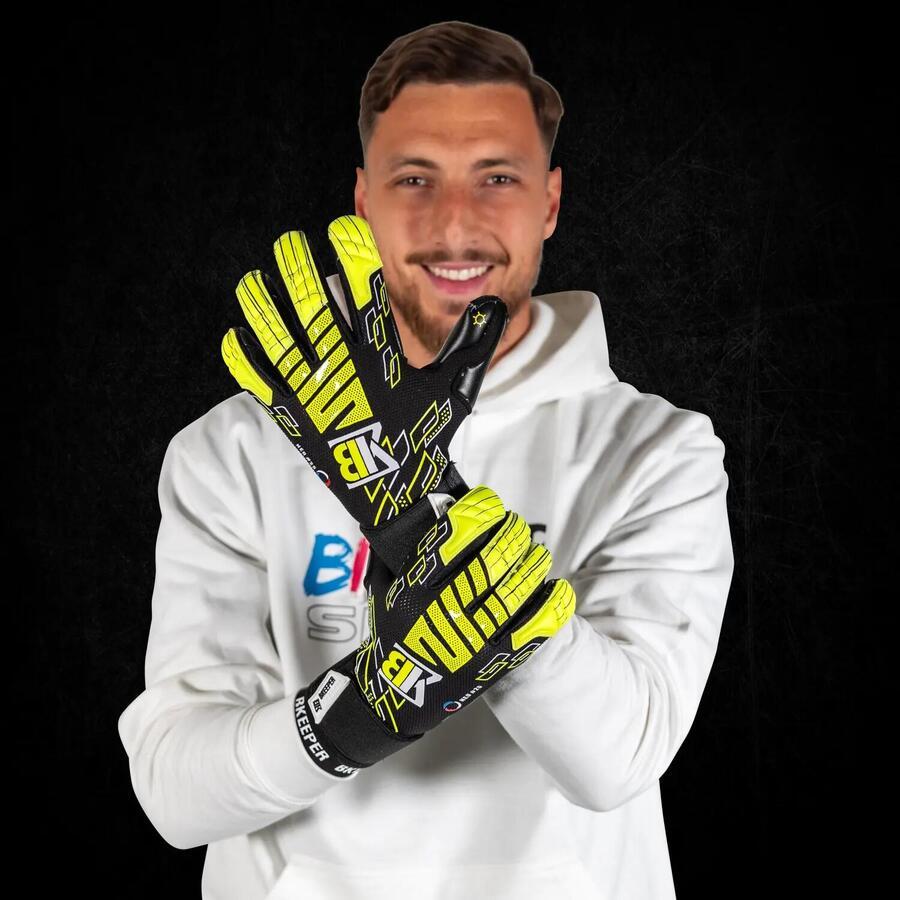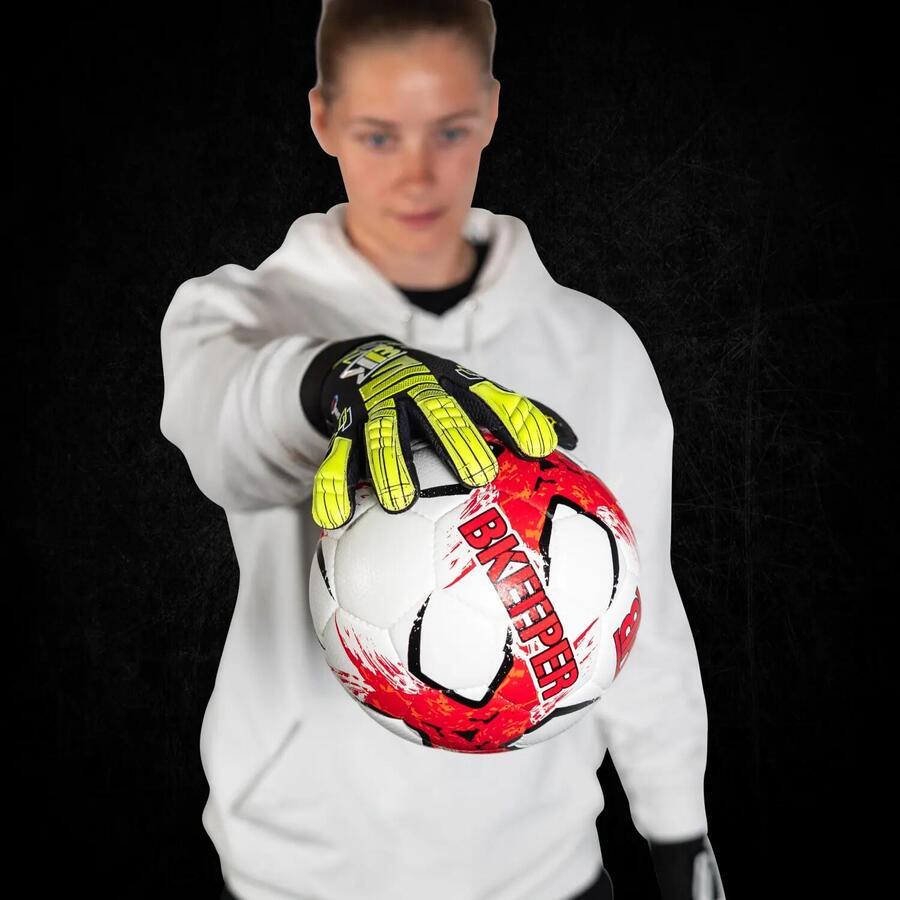 Она изготовлена из латекса толщиной 4 мм для лучшего сцепления с мячом во мокрых условиях и амортизирующей пены 3 мм внутри футбольной перчатки.