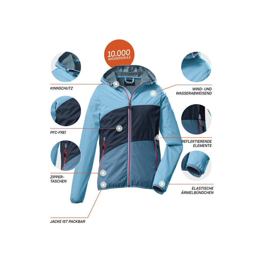 Функциональная куртка Killtec для девочек с водонепроницаемостью 10 000 мм водяного столба и капюшономДвухслойная функциональная куртка Killtec с капюшоном для девочек легко упаковывается в собственный карман и берётся с собой куда угодно. Материал ветронепроницаем и, благодаря водонепроницаемости 10 000 мм водяного столба, водоотталкивающий. Эта куртка для активного отдыха оснащена эластичными манжетами, боковыми карманами на молнии и модными светоотражающими элементами. Диагональный дизайн с цветовыми блоками в модных цветах также делает куртку по-настоящему привлекательной. Поэтому эта куртка не содержит ПФУ.