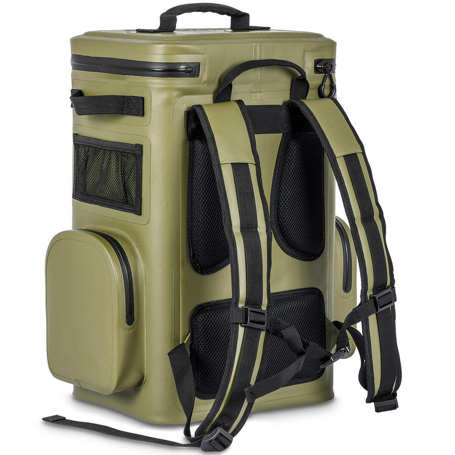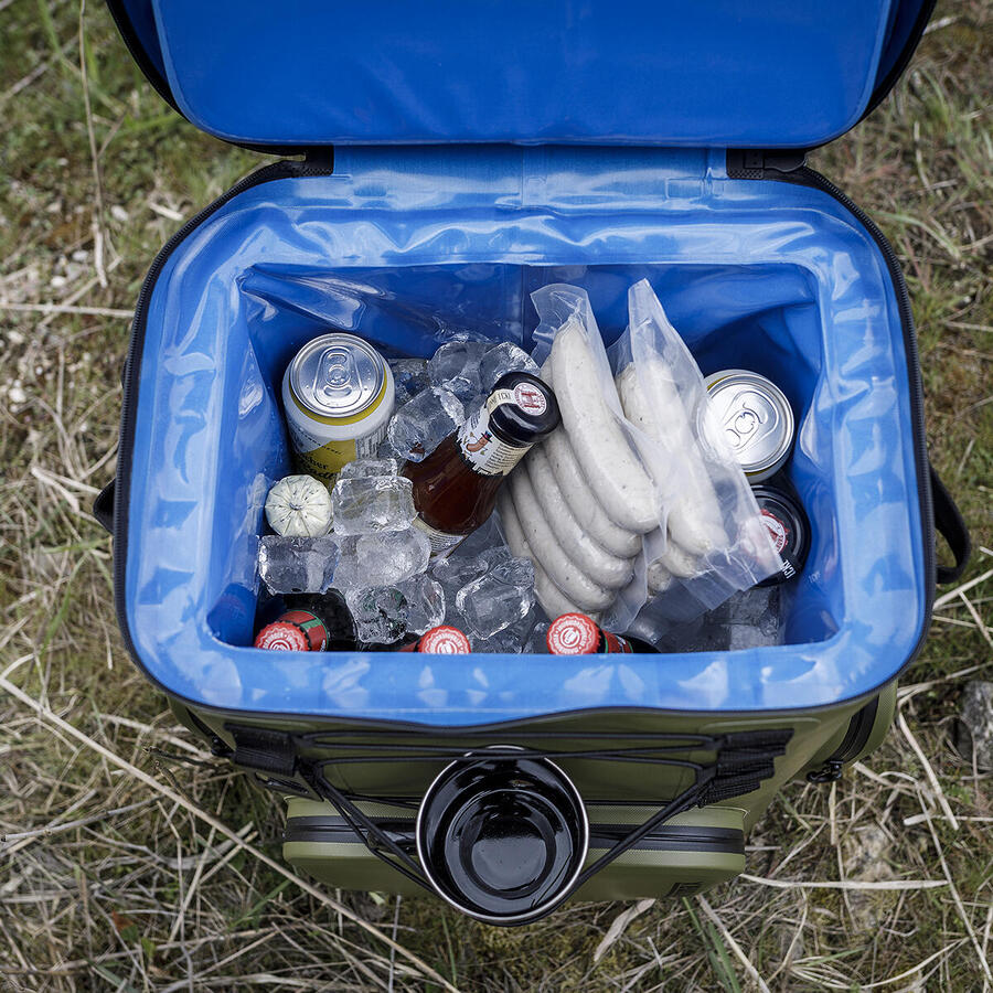 Рюкзак-холодильник Petromax объемом 17 л сохраняет продукты прохладными до 18 часов, оставляя руки свободными. 20-миллиметровая пенополиуретановая изоляция в двойных стенках минимизирует проникновение тепла. Двойная водонепроницаемая молния YKK не пропускает холод. Мягкие плечевые ремни и вентилируемая задняя панель гарантируют комфортную переноску даже при полной загрузке. Усиленное дно предотвращает провисание, а сливное отверстие позволяет легко слить талую воду. Внешний слой из полиэстера Oxford оливково-зеленого цвета водоотталкивающий и прочный. Идеально подходит для походов, велопрогулок и фестивалей.