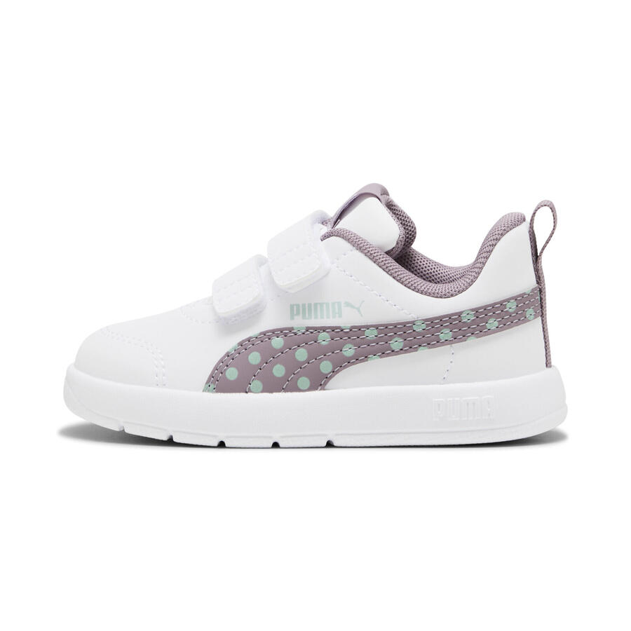 Представляем Courtflex v3, новейшего члена семейства Courtflex! Это идеальная обувь для повседневных занятий. Она отличается более современным внешним видом и повышенной гибкостью благодаря более глубоким канавкам на подошве. Версия Dotty отличается красивым красочным точечным графическим принтом на PUMA Formstrip.