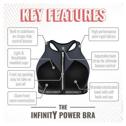 Infinity Power Bra — первый спортивный бюстгальтер, обеспечивающий максимальный контроль подъёма груди и полную свободу движений. Мы вдохновились вашими отзывами: прислушавшись к пожеланиям клиентов, мы разработали бюстгальтер, который выведет ваши тренировки на новый уровень. Infinity Bra также фиксирует ткань груди, поскольку его конструкция помогает уменьшить вертикальное смещение сверху, сохраняя при этом привычную поддержку пояса снизу. Он оснащен регулируемой бретелькой сзади для оптимального контроля подъёма груди и встроенными стабилизаторами на бретельках. Особенности: Полное покрытие. Молния спереди для лёгкой регулировки. Гибкая Y-образная спинка обеспечивает полную свободу движений лопаток. Дышащие формованные чашки обеспечивают комфорт и не закрывают ареолы. Полужесткие, высокотехнологичные ткани с контролем влаги. ПРЕИМУЩЕСТВА: Исключительный контроль подъёма груди благодаря инновационной системе поддержки, которая фиксирует грудь в центре тела (грудная клетка, надгрудинная ямка), а не на плечах и боках. До 80% меньше подъёма груди*. Свобода движений: Y-образная конструкция спинки с одним регулируемым ремнём концентрирует нагрузку на одной вертикальной линии, обеспечивая свободу движений лопаток. Отмечен наградами Health & Wellbeing Awards 2020.