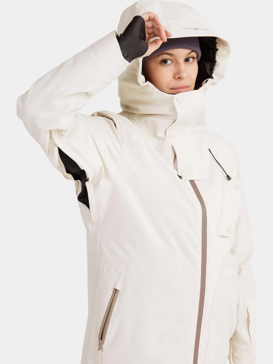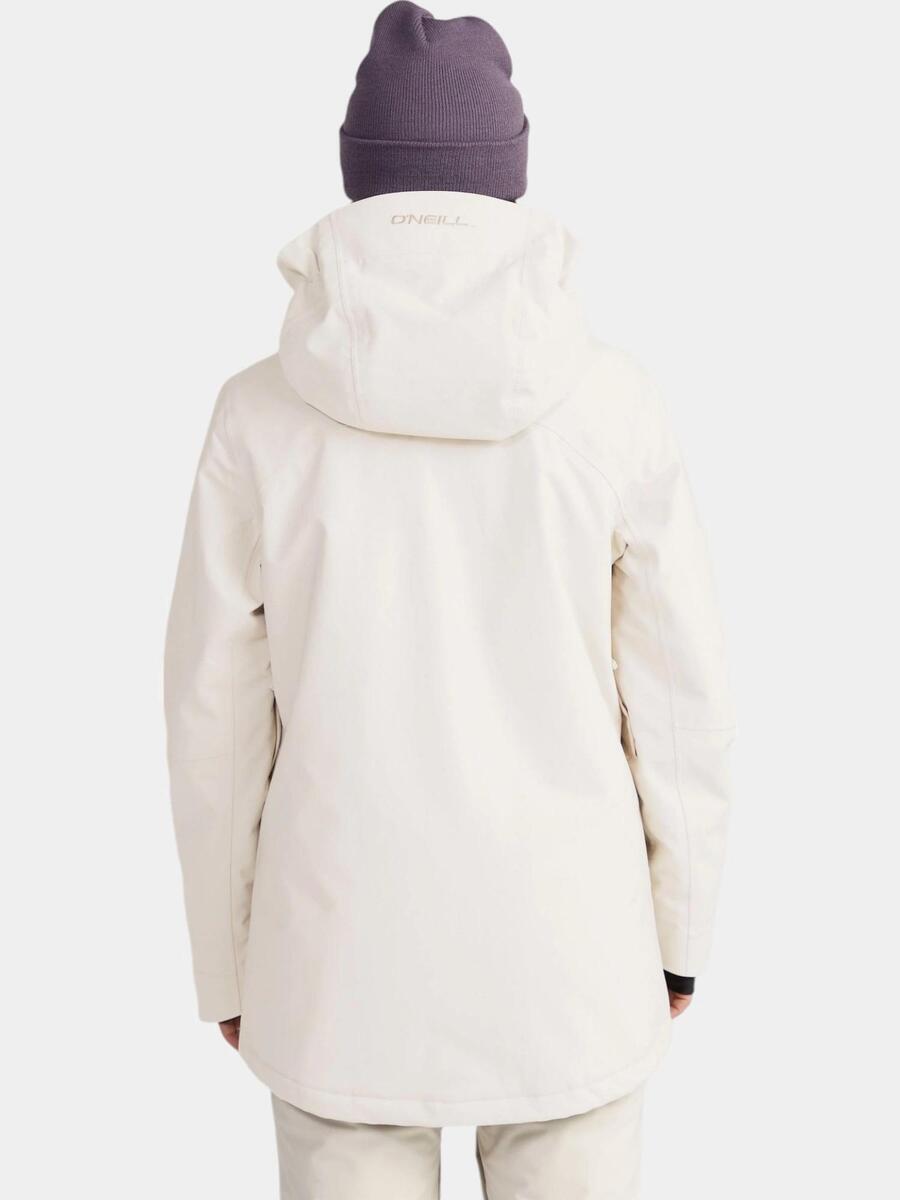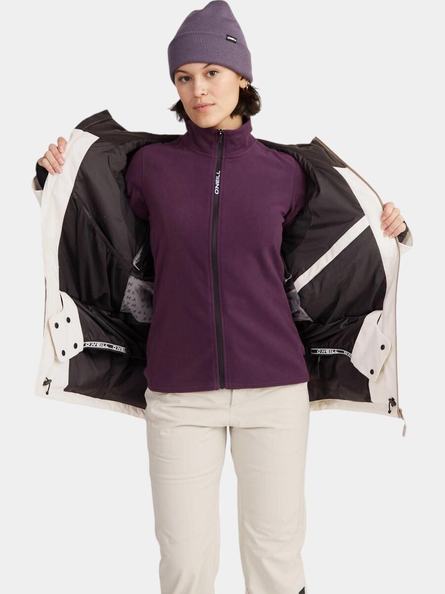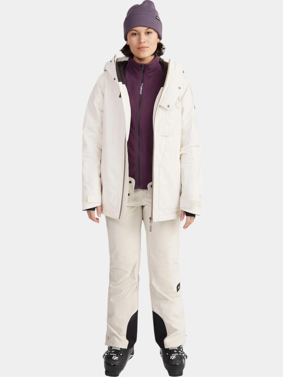 Женская горнолыжная куртка O'Neill Aplite Pro Snow Jacket из линейки O'Neill Blue - Repreve изготовлена на 60% из переработанных волокон. Эта спортивная, очень удобная зимняя куртка отличается эластичным кроем и широким кроем, что обеспечивает полную свободу движений и позволяет комбинировать ее с технической одеждой. Основная молния позволяет легко снять куртку. Фиксированный, совместимый со шлемом, регулируемый капюшон, регулируемый шнурком подол и высокий воротник защищают от холодного ветра. Внешние карманы на молнии, внутренний карман, карман для горнолыжных очков и карман для ски-пасса вместят все необходимое на склоне. Манжеты с петлями для больших пальцев плотно облегают запястье, сохраняя руки в тепле, не стесняя движений и не допуская задирания рукавов. Проклеенные швы защищают от внезапных осадков. Высококачественная мембрана, используемая в куртке, предотвращает проникновение холодного ветра или нежелательной влаги при любых обстоятельствах, при этом позволяя поту, выделяемому во время активного движения, выходить наружу. Водонепроницаемость 20 000 мм означает, что каждый квадратный сантиметр куртки выдерживает давление воды не менее 20 000 миллиметров, не пропуская влагу. Это значение свидетельствует о премиальном качестве одежды: куртка остается непроницаемой для воды даже под сильным дождем. Куртка имеет двухслойную конструкцию материала: мембрана прикреплена к внутренней стороне материала и образует первый слой, в то время как второй, дышащий слой, неплотно пришит к внутренней стороне изделия. Вентиляционные отверстия позволяют легко регулировать теплоотдачу, а снегозащитная юбка, которая крепится к брюкам, предотвращает попадание снега под одежду даже при сильных падениях. Отделка DWR без PFC предотвращает прилипание капель воды к поверхности материала; вода собирается в мелкие капли и скатывается с куртки, что позволяет носить ее даже в сырую погоду. Куртка оснащена утеплителем Firewall Magma плотностью 80/60 грамм, вдохновленным 70-летним наследием бренда в области серфинга. Эргономично распределенная синтетическая подкладка, разработанная с учетом температурных характеристик тела, утолщена в чувствительных зонах, сохраняя тепло даже в неблагоприятных погодных условиях, не снижая воздухопроницаемости. Специальное цинковое покрытие обеспечивает правильную терморегуляцию тела, помогая сохранять тепло и предотвращая его потерю, сохраняя температуру до 4 градусов выше, чем при использовании подкладки с традиционными технологиями. Воздухопроницаемость горнолыжной куртки составляет 20 000 г/м²/24 ч.