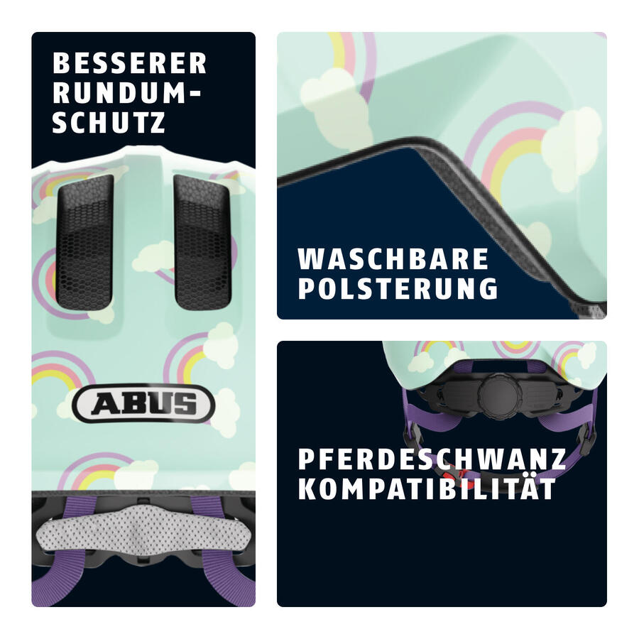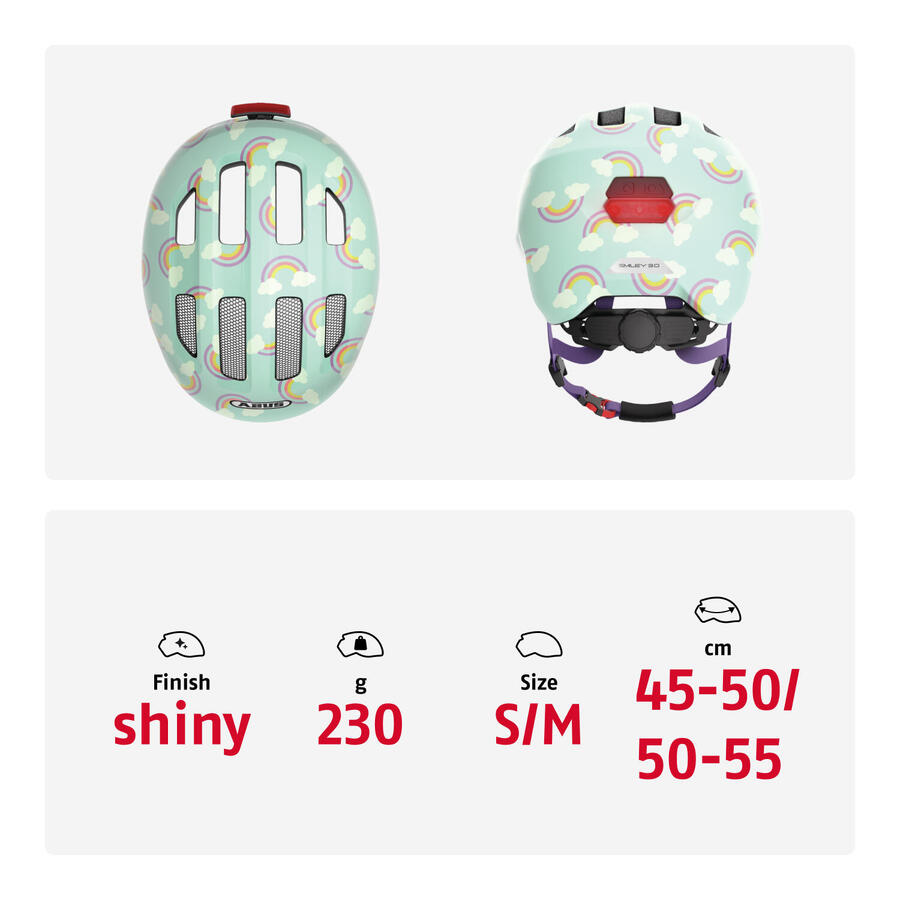 ABUS Smiley 3.0 LED — детский велосипедный шлем с подсветкой для большей безопасностиПодобно тому, как дети понемногу развиваются каждый день, так же развивается и популярный детский шлем Smiley от ABUS. Благодаря полностью переработанной внешней форме, адаптированным функциям и великолепному дизайну, он является востребованной защитой головы для начинающих велосипедистов. Будь то в прицепе, на родительском велосипедном сиденье, на трехколесном велосипеде или на вашем первом беговеле — Smiley 3.0 LED всегда будет надежным спутником. Этот велосипедный шлем для детей от 1 года обеспечивает хорошую всестороннюю защиту. Глубокая посадка и, в частности, передний край защищают голову и лицо ребенка. Система регулировки по высоте позволяет легко отрегулировать шлем по окружности головы — как по ширине, так и по высоте на затылке. Еще одно преимущество системы регулировки по высоте — для детей с длинными волосами. Он оставляет место для конского хвоста. Это избавит от раздражающего давления регулировочного колеса на конский хвост. Блестящие шлемы радуют юных велосипедистов своим ярким, дружелюбным к детям дизайном. Особенностью светодиодной версии является задний фонарь. Это позволяет кататься на велосипеде в сумерках, не оставаясь незамеченным. Благодаря этой модели каждый мальчик и девочка найдут себе защиту головы, которая им понравится. Другие преимущества продукта: Технология In-Mold: производственный процесс создает прочное соединение между внешней оболочкой и амортизирующим жестким пеноматериалом (EPS). Детский велосипедный шлем с подсветкой: обзор на 180° и зарядка через USB. Zoom Ace Kids: система регулировки по высоте и позволяет индивидуально подогнать шлем по размеру. Вентиляция: 4 входных и 4 выходных отверстия для воздуха для предотвращения перегрева. Съемная и моющаяся подкладка для комфорта. Встроенные москитные сетки для защиты от насекомых. Пассивная безопасность благодаря светоотражателям.