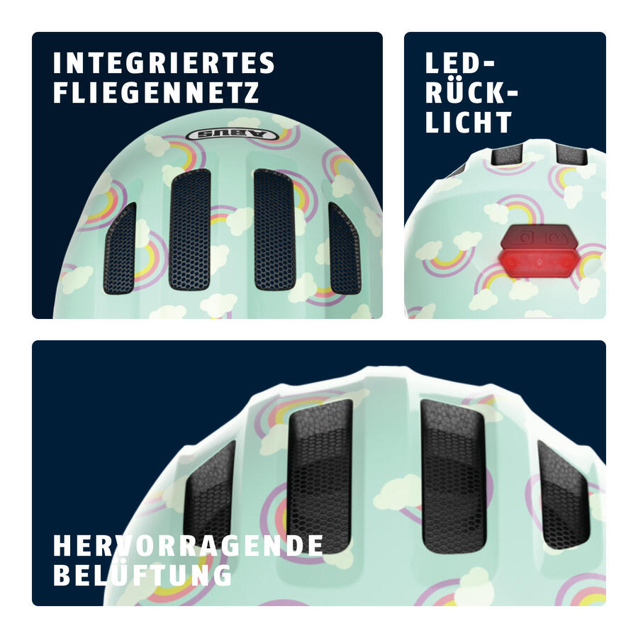 ABUS Smiley 3.0 LED — детский велосипедный шлем с подсветкой для большей безопасностиПодобно тому, как дети понемногу развиваются каждый день, так же развивается и популярный детский шлем Smiley от ABUS. Благодаря полностью переработанной внешней форме, адаптированным функциям и великолепному дизайну, он является востребованной защитой головы для начинающих велосипедистов. Будь то в прицепе, на родительском велосипедном сиденье, на трехколесном велосипеде или на вашем первом беговеле — Smiley 3.0 LED всегда будет надежным спутником. Этот велосипедный шлем для детей от 1 года обеспечивает хорошую всестороннюю защиту. Глубокая посадка и, в частности, передний край защищают голову и лицо ребенка. Система регулировки по высоте позволяет легко отрегулировать шлем по окружности головы — как по ширине, так и по высоте на затылке. Еще одно преимущество системы регулировки по высоте — для детей с длинными волосами. Он оставляет место для конского хвоста. Это избавит от раздражающего давления регулировочного колеса на конский хвост. Блестящие шлемы радуют юных велосипедистов своим ярким, дружелюбным к детям дизайном. Особенностью светодиодной версии является задний фонарь. Это позволяет кататься на велосипеде в сумерках, не оставаясь незамеченным. Благодаря этой модели каждый мальчик и девочка найдут себе защиту головы, которая им понравится. Другие преимущества продукта: Технология In-Mold: производственный процесс создает прочное соединение между внешней оболочкой и амортизирующим жестким пеноматериалом (EPS). Детский велосипедный шлем с подсветкой: обзор на 180° и зарядка через USB. Zoom Ace Kids: система регулировки по высоте и позволяет индивидуально подогнать шлем по размеру. Вентиляция: 4 входных и 4 выходных отверстия для воздуха для предотвращения перегрева. Съемная и моющаяся подкладка для комфорта. Встроенные москитные сетки для защиты от насекомых. Пассивная безопасность благодаря светоотражателям.