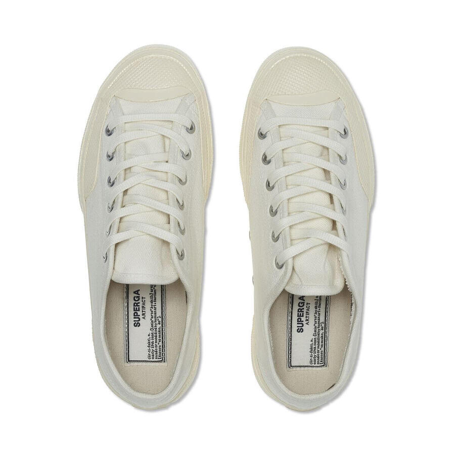 Works — это кроссовки из проекта Artifact by Superga, изготовленные из специальной хлопковой саржи Broken Twill, типичной для рабочей одежды и отличающейся прочной, но элегантной текстурой. Модель выполнена в винтажном стиле 70-х годов: блочная подошва, слегка квадратный носок и прорезиненные края по бокам.