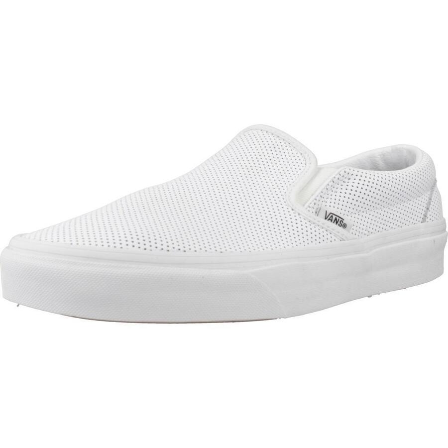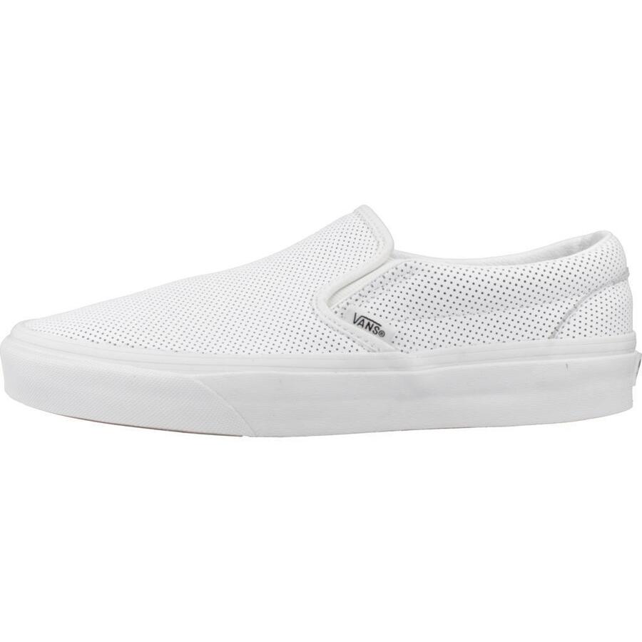 Модель Vans Classic Slip-On белого цвета с текстильным верхом. Вулканизированная конструкция. Сделано на Филиппинах.