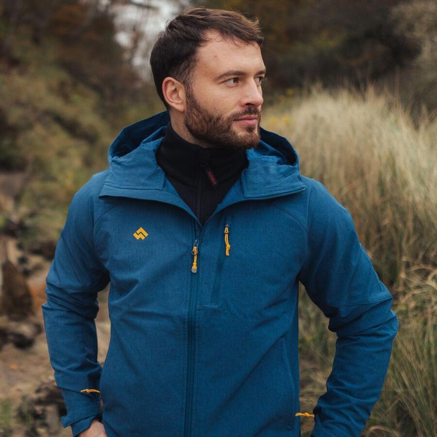 Материал софтшелл имеет водоотталкивающую пропитку DWR (Durable Water Repelency), что делает его влагоотталкивающим, быстросохнущим и воздухопроницаемым. Усиленный капюшон надежно защищает лицо от ветра, дождя и капризов погоды.