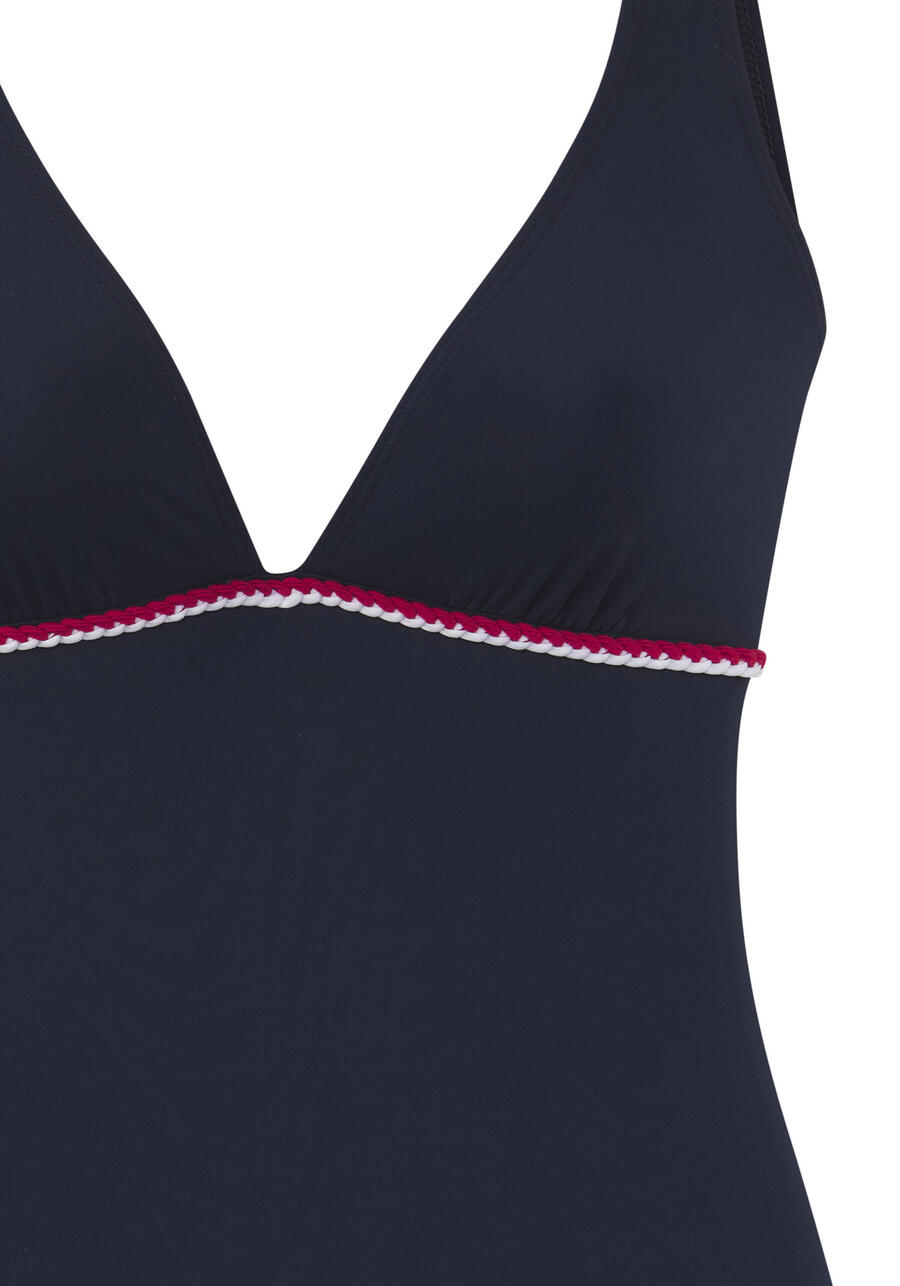 Однотонный купальник S. Oliver с контрастными завязками под грудью. Глубокий V-образный вырез. Мягкие съёмные чашечки. Круглая спинка с застёжкой. Регулируемые бретели. Комфортное качество благодаря переработанному полиамиду. ING-61G