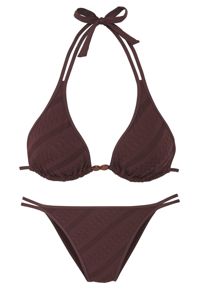 Треугольное бикини от S. Oliver. Лиф с халтер-бретелькой, двойными бретельками и декоративными бусинами между чашечками. Мягкие съёмные чашечки. Плавки бикини с узкими завязками по бокам. Однотонный дизайн. Элегантная фактурная ткань. GOA-87