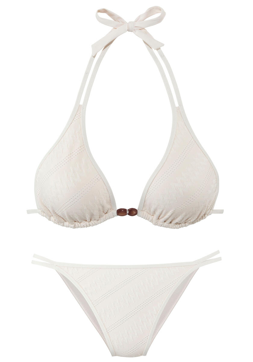 Треугольное бикини от S. Oliver. Лиф с халтер-бретелькой, двойными бретельками и декоративными бусинами между чашечками. Мягкие съёмные чашечки. Плавки бикини с узкими завязками по бокам. Однотонный дизайн. Элегантная фактурная ткань. GOA-87