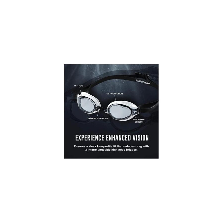 Гидроскопическая форма линз для максимального фовеального и периферического зрения при минимальном движении головы. Традиционный уплотнитель очков Speedsocket для надежной посадки и производительности. Высокопроходные сменные переносицы для индивидуальной посадки (S, M, L). Двойной силиконовый ремешок для быстрой и надежной посадки. Эргономичный изогнутый задний зажим для плотного прилегания под кепкой. Линзы с антизапотевающим покрытием со 100% защитой от ультрафиолета от всех вредных UVA и UVB излучений. Линзы с хромированным зеркальным покрытием для уменьшения яркости и бликов — идеально подходят для гонок и триатлонов.