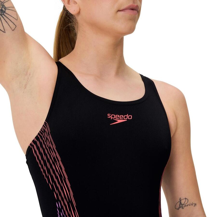 Купальник Speedo Placement Muscleback чёрно-фиолетового цвета идеально подходит для атлетичных пловцов, которые хотят получить максимальную отдачу от тренировок. Этот стильный купальник обеспечивает удобную посадку и оптимальную свободу движений благодаря устойчивой к хлору ткани Endurance+. Облегающий крой Muscleback обеспечивает свободу движений, а открытая горловина и разрезы на спине дарят уверенность во время тренировки. Абстрактная графика Shear Wave обеспечит вам не только функциональность, но и стильный вид в бассейне. Этот купальник идеально подходит для интенсивных тренировок и поможет вам без усилий достичь своих целей в плавании.