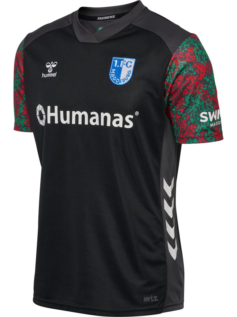 Третья футболка ФК Магдебург 24/25 выполнена в строгом чёрном цвете с тональными плечевыми вставками и контрастными рукавами с красно-зелёным камуфляжным рисунком. Футболка имеет ребристый V-образный вырез, белые шевроны Hummel по бокам и логотип Hummel по центру на груди рядом с эмблемой клуба. Футболка изготовлена из технологичной ткани с влагоотводящими свойствами для эффективной игры и комфорта на поле.