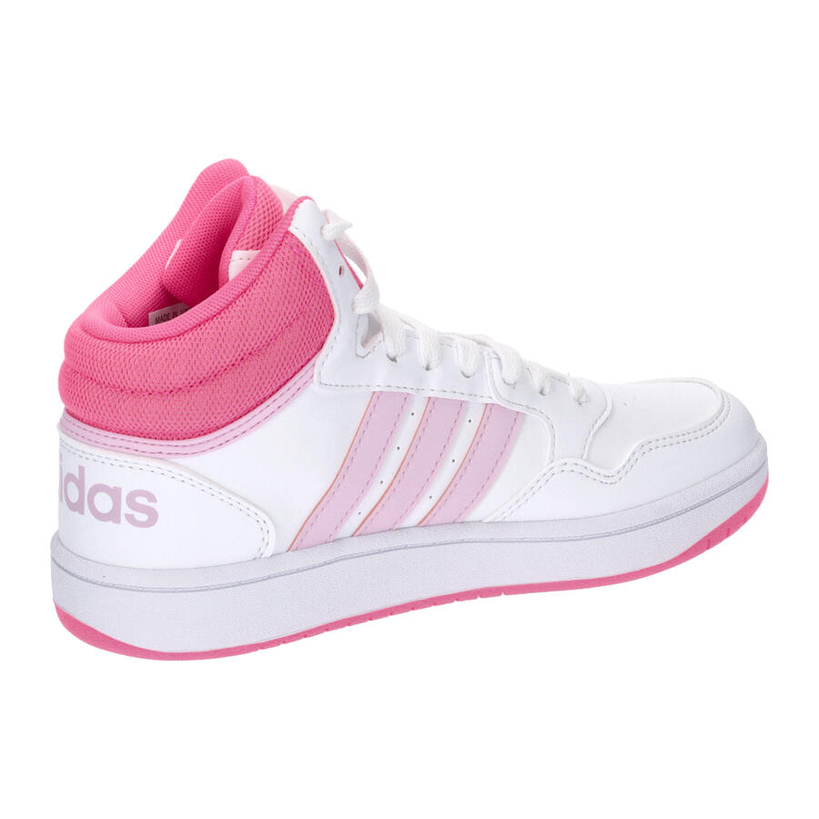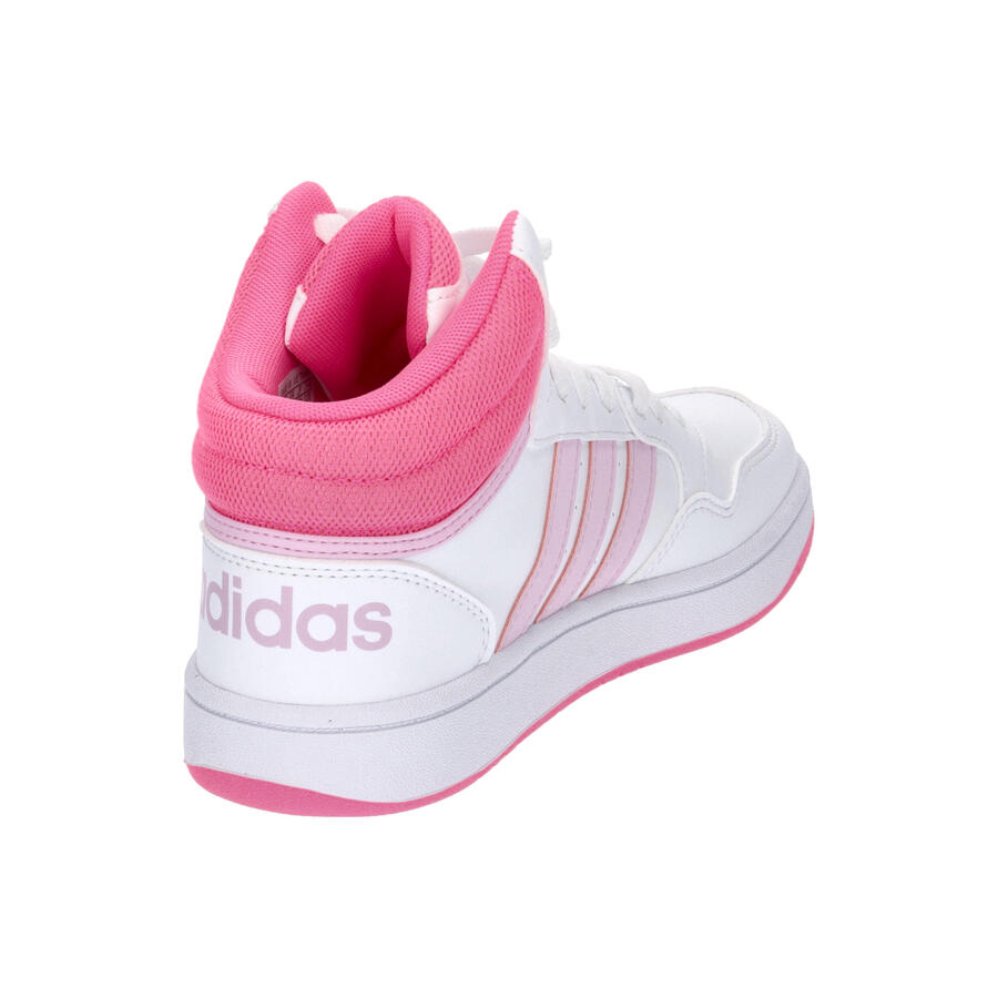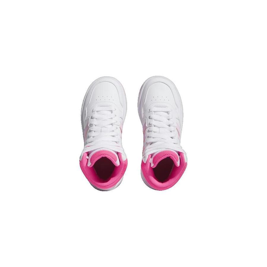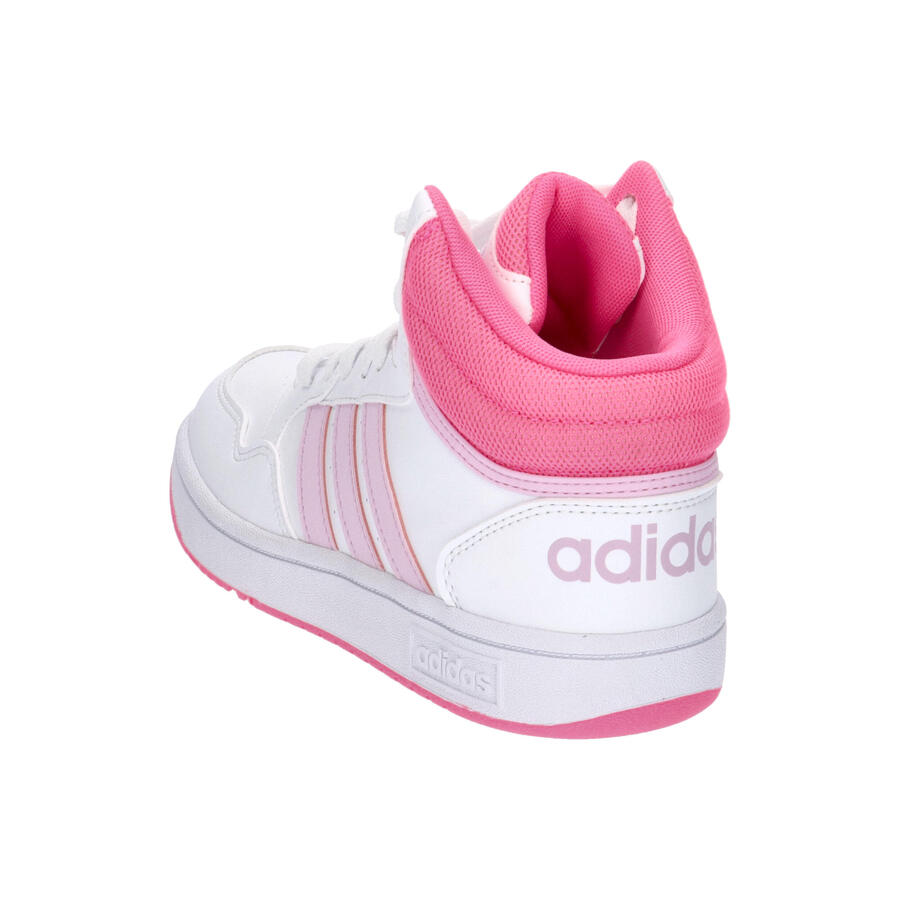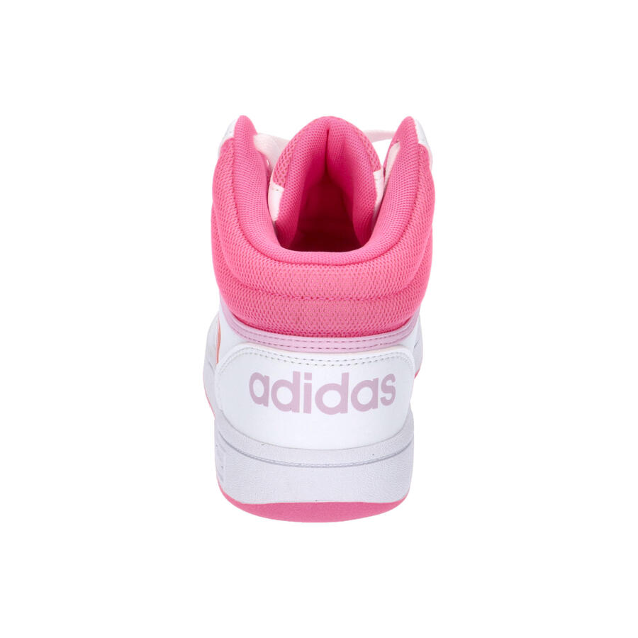 Детские кроссовки Adidas Hoops Mid, белые с розовым, IF2722. Характеристики: Эти детские кроссовки Adidas обеспечат комфорт ногам вашего ребенка каждый день. Синтетический верх средней длины с текстильной подкладкой. Воротник с тканевой вставкой. Классическая шнуровка. Амортизирующая промежуточная подошва. Резиновая подошва с разнонаправленным протектором. Обувь частично изготовлена из переработанных материалов.