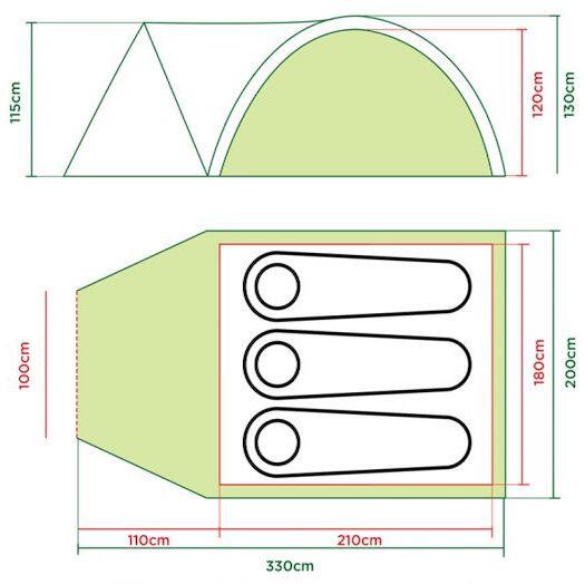 Внешняя палатка: 100% полиэстер, 68 D 185 T полиэстер рипстоп, ПУ (полиуретановое) покрытие, огнестойкие, сварные швы. Окно: прозрачный ПВХ (поливинилхлорид). Внутренняя палатка: 100% полиэстер, дышащий 68 D 185 T полиэстер и непрозрачная противомоскитная сетка. Пол: 140 г/м² PE, сварной и поднятый по краям. Максимальная внутренняя высота: 120 см. Размеры спального места: 3,8 м². Место для хранения: 1,9 м². Конструкция: купол с выступающим туннелем. Установка: сначала внутренняя палатка. Внутренние карманы: 3. Размеры упаковки: 17 x 54 см. Сумка для переноски: полиэстер.