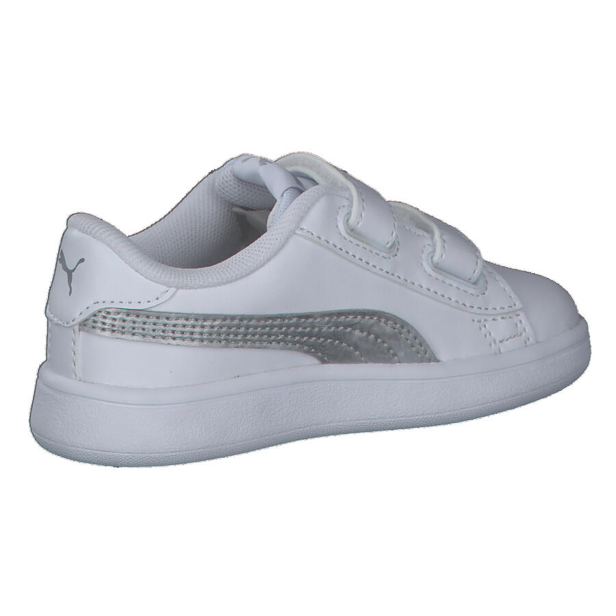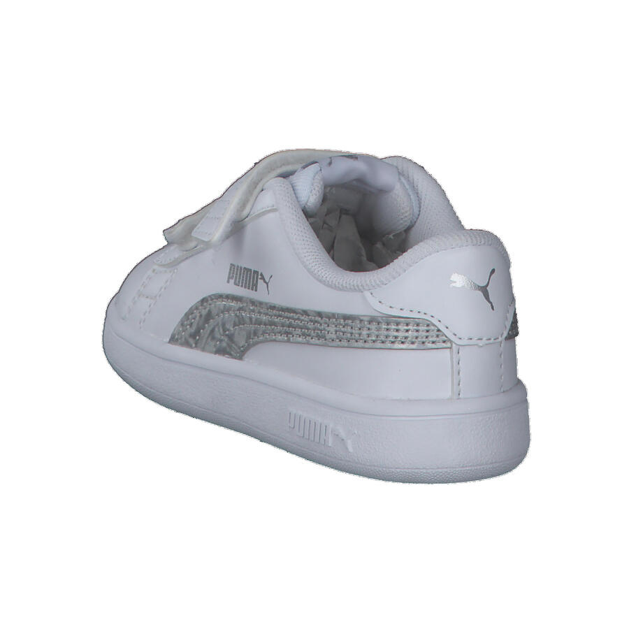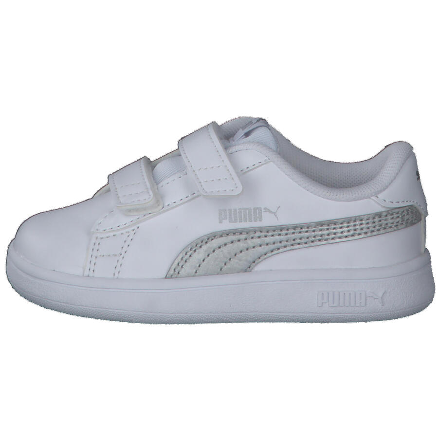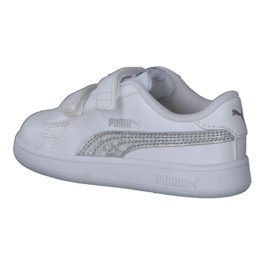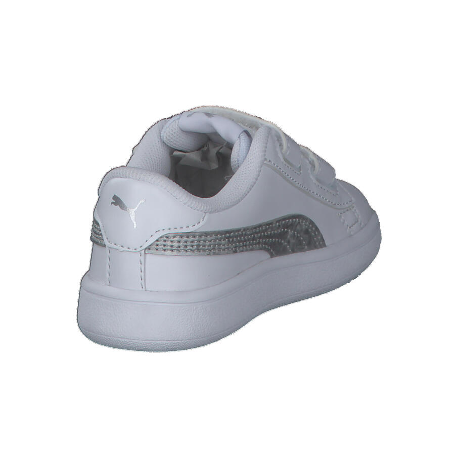 Детские кроссовки Puma Smash v2 Metallics V Inf. Сохранив все отличительные черты классических кроссовок PUMA, включая длинные, четкие линии и знаменитую боковую полоску, эта модель, вдохновленная теннисом, отличается верхом из искусственной кожи и женственными металлическими деталями на пятке, язычке и боковой панели. Изысканное, но стильное дополнение к любому повседневному образу. Верх: другой материал. Подкладка и стелька: текстиль. Подошва: другой материал.