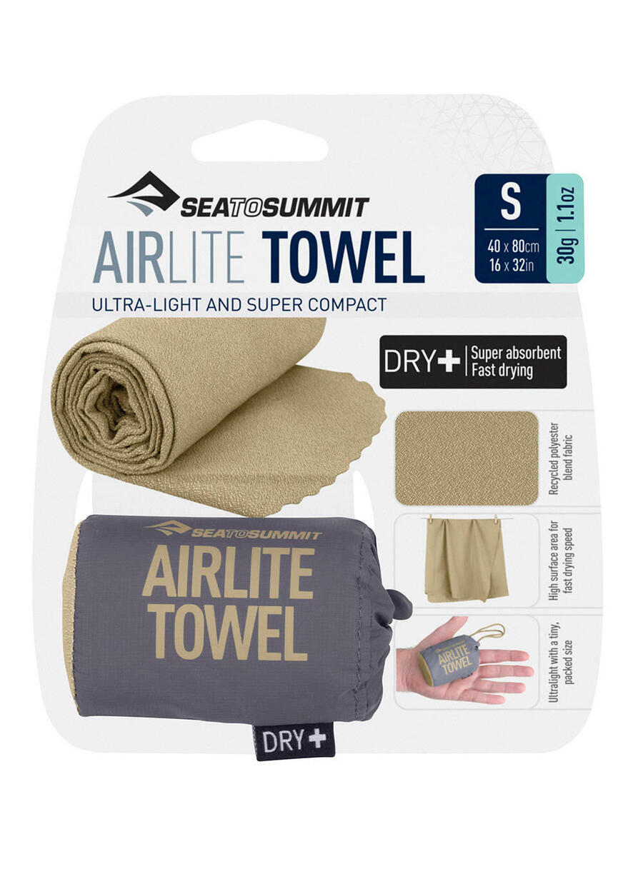 Полотенце Sea to Summit Airlite S цвета пустынный коричневый — идеальный спутник для путешествий, занятий спортом и отдыха на природе. Размером 80 x 40 см и весом всего 30 г оно впитывает воды, в три раза тяжелее собственного веса. Микрофибра (85% переработанного полиэстера, 15% нейлона) очень быстро сохнет и компактно складывается. В комплект входит нейлоновый мешок плотностью 15D с петлей для подвешивания. Идеально подходит для пеших прогулок, кемпинга, занятий в спортзале и повседневного использования.