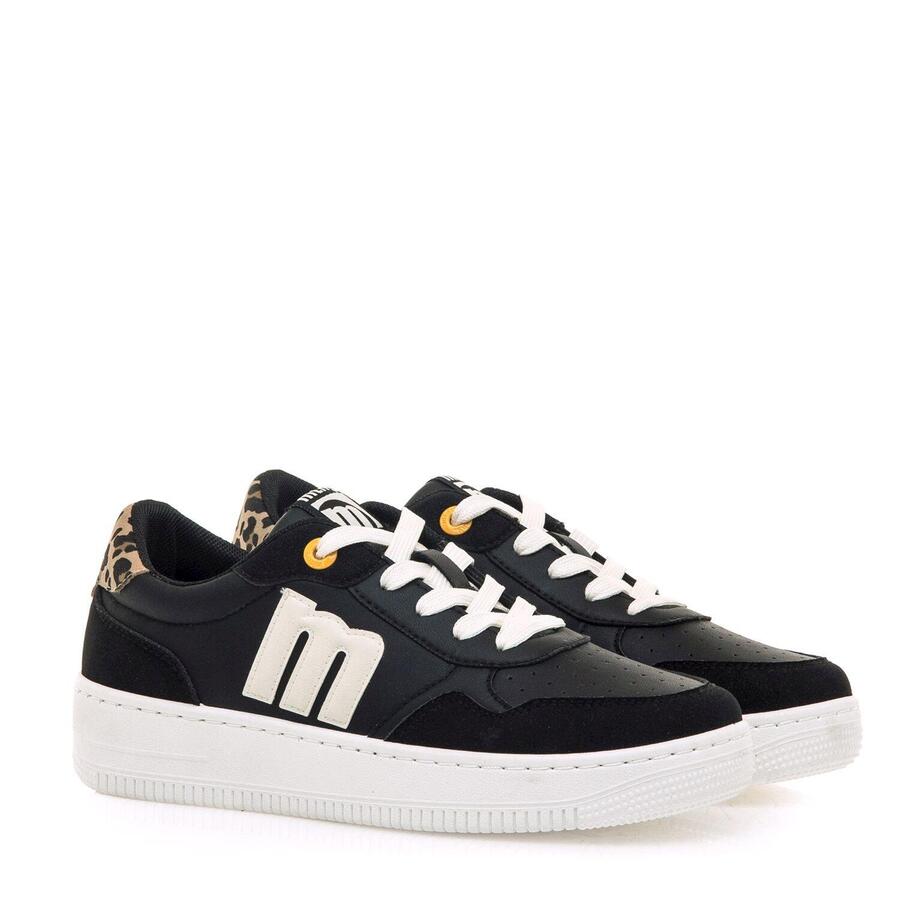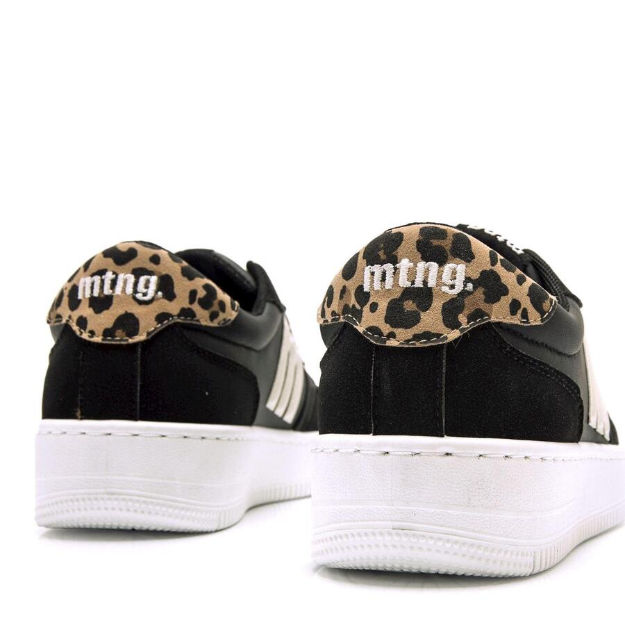 Черные женские кроссовки MTNG, модель Gravity. Дизайн, вдохновленный баскетболом, перфорация в области носка и двухцветный дизайн, подчеркнутый боковым логотипом и леопардовым принтом на пятке. Белая межподошва обеспечивает дополнительный комфорт и визуальный контраст. Шнуровка с оранжевым металлическим люверсом — оригинальный акцент. Идеально сочетается с джинсами, джоггерами и другими повседневными нарядами. Сертифицировано INESCOP как VEGAN — материалы не содержат волокон животного происхождения.Стиль: СпортивныйОсновной материал: СинтетическийВнутренний материал: СинтетическийМатериал стельки: СинтетическийМатериал подошвы: РезинаТип каблука: ПлоскийВысота каблука: Средняя (от 3 до 5 см)Форма носка: КруглаяТип застежки: Шнурки